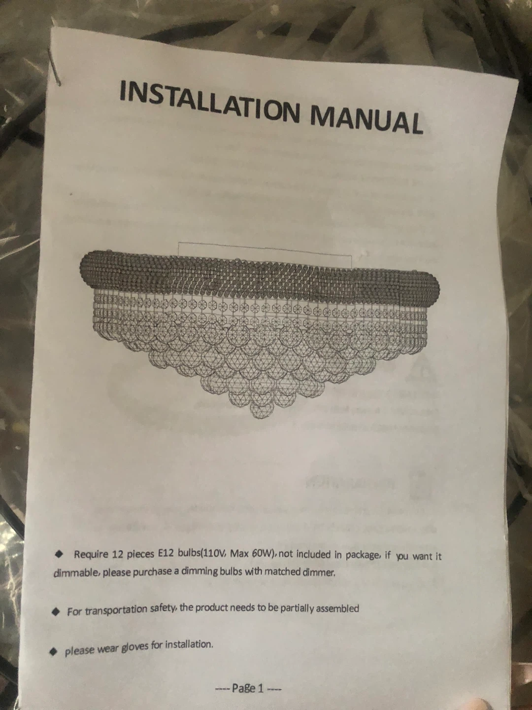 60Chandelier with installation manual. The installation manual says it requires 12 E12 bulbs (110V, Max 60W). Bulbs are not included in the package. If you want it dimmable, please purchase a dimming bulbs with matched dimmer. For transportation safety, the product needs to be partially assembled. Please wear gloves for installations. 23 inches in diameter