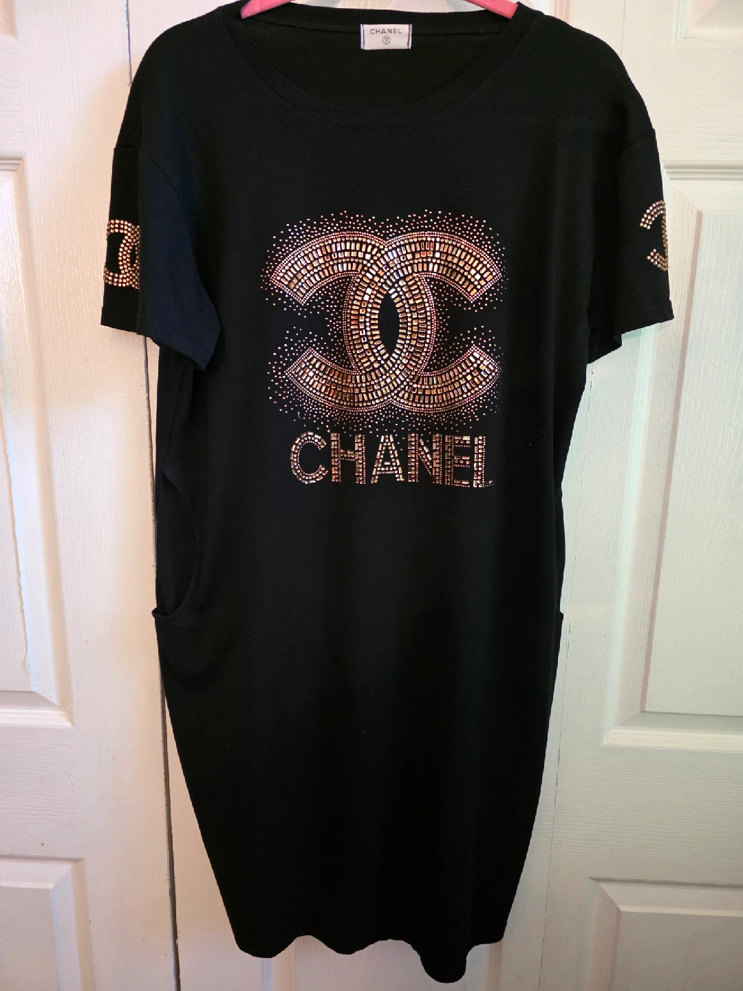 Selling a Chanel black dress. It has the Chanel logo on the front. It's in good condition and ready for a new home!