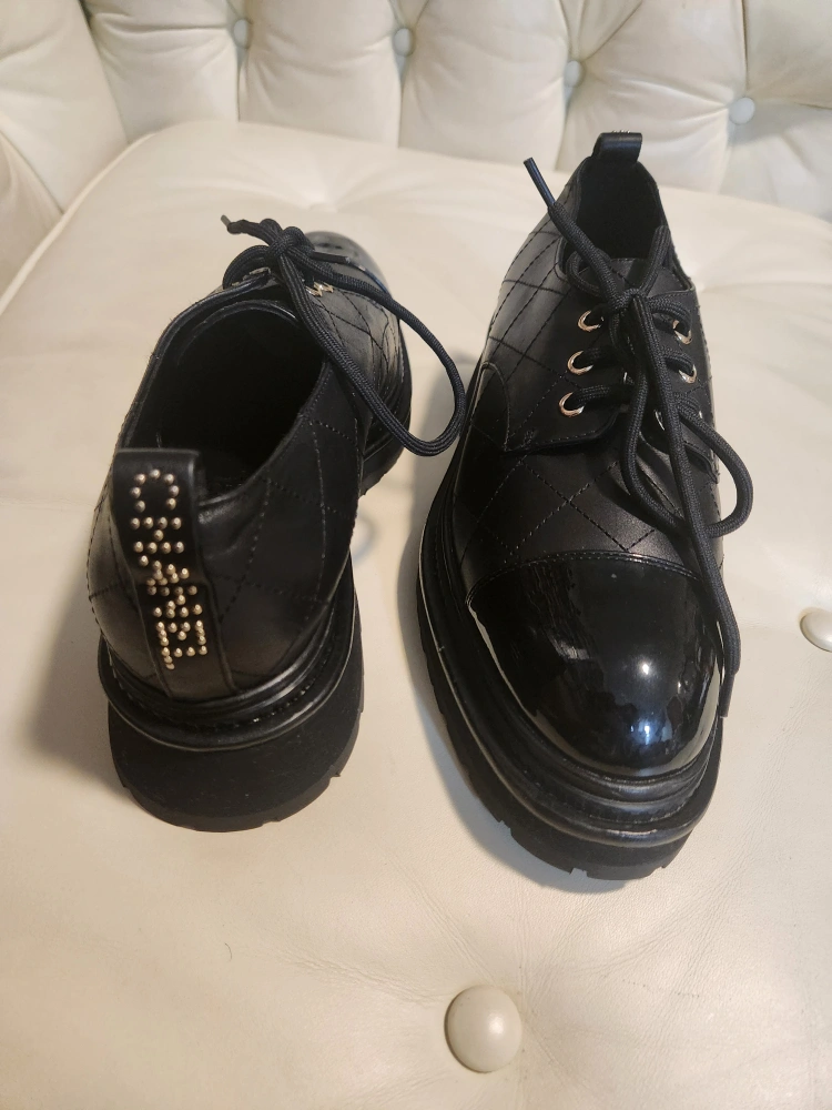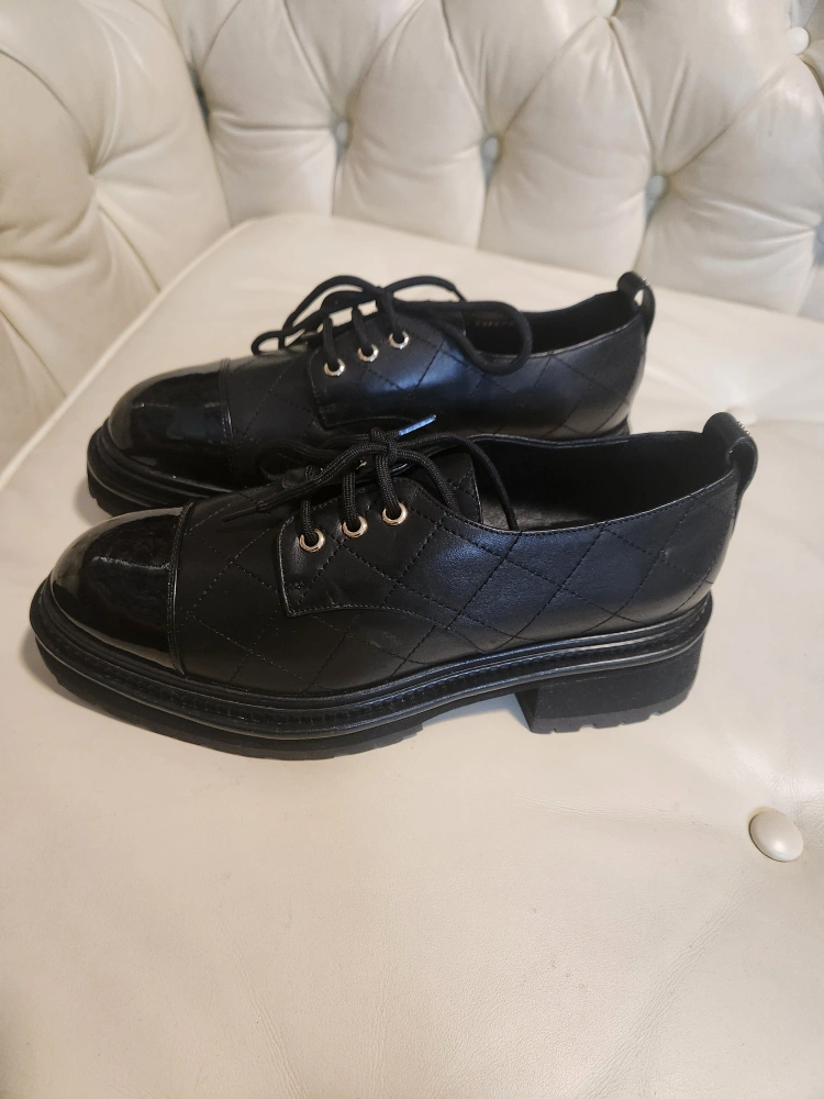 Selling a pair of Chanel black leather platform oxfords. These shoes feature a quilted design and a patent leather toe cap. They're in great condition and ready for a new home!
