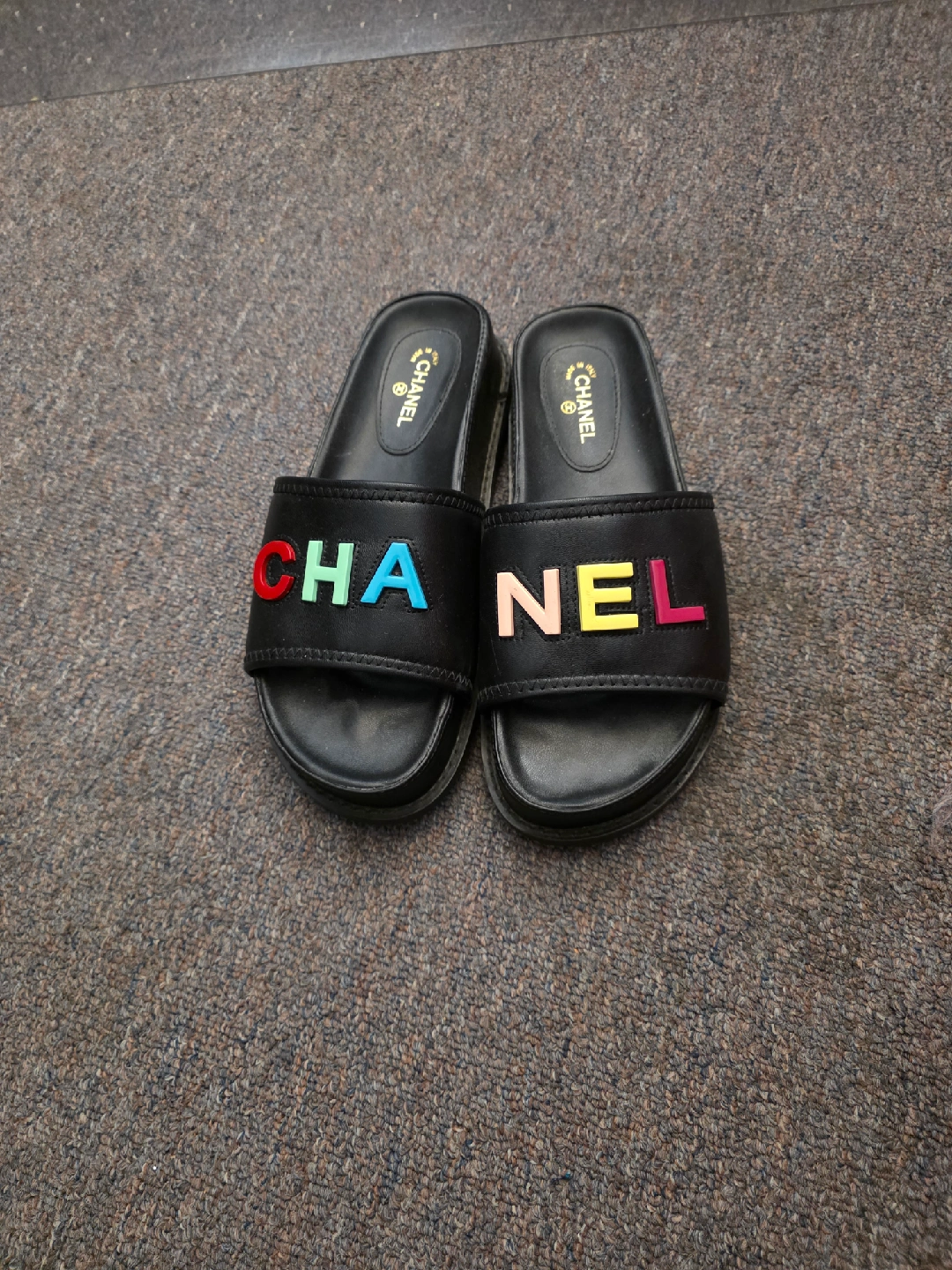 These are a pair of black leather Chanel slide sandals. They feature the Chanel logo in colorful letters across the strap. They are in good condition and ready for a new home!