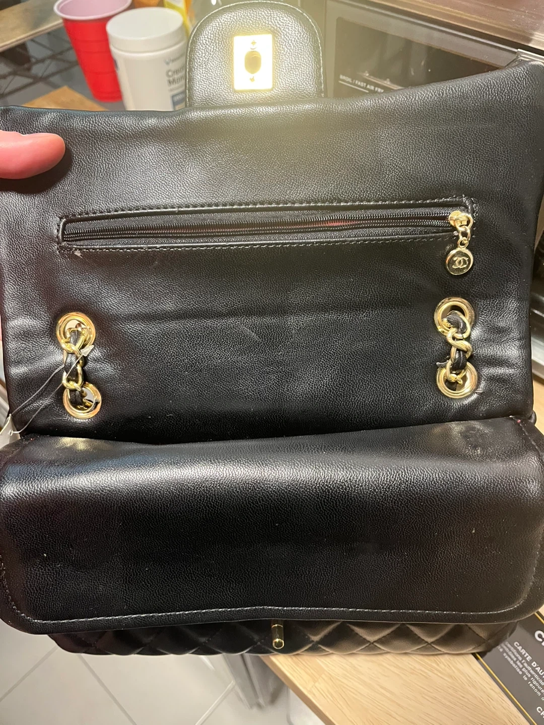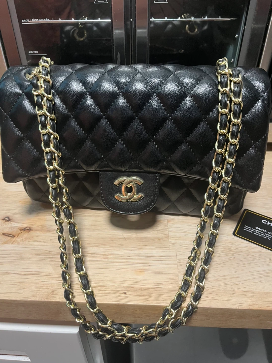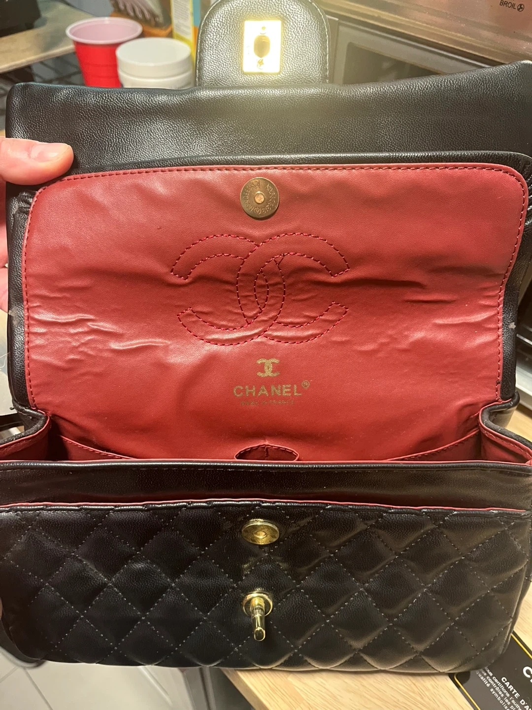28Selling a classic Chanel black quilted handbag. It features a gold chain and the iconic Chanel logo. The interior is red. Perfect for adding a touch of elegance to any outfit!