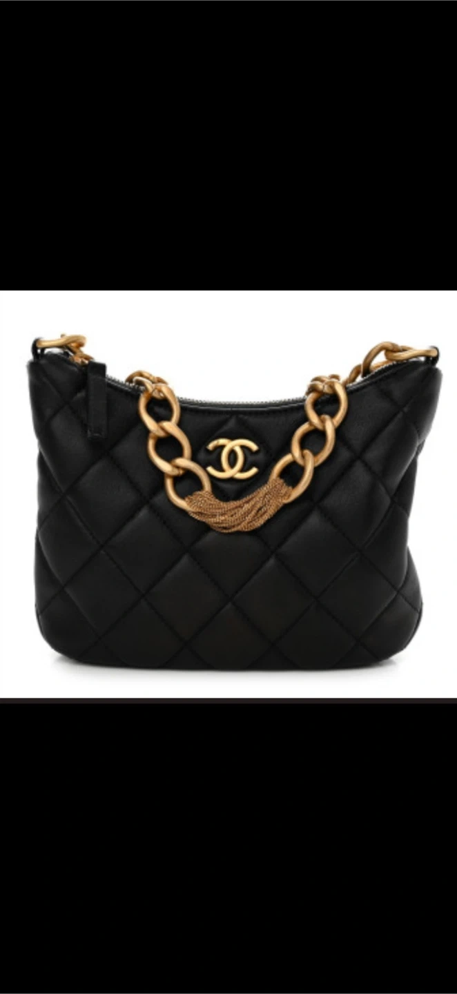 This is a Chanel shoulder bag in black quilted leather with a gold chain strap. It's a stylish and classic piece that can be dressed up or down. The bag is in great condition and ready for a new home