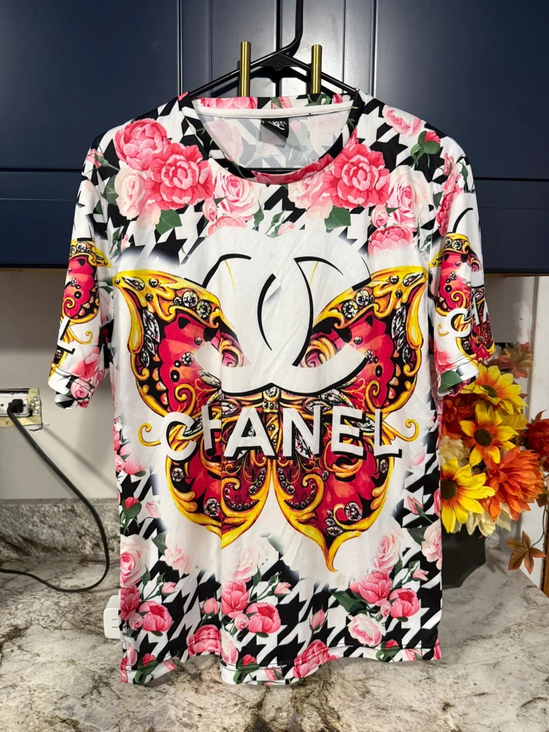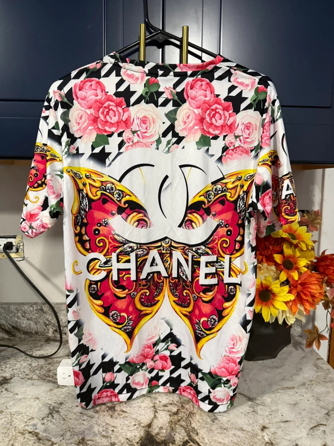Not real brand Here's a Chanel T-shirt with a vibrant butterfly and floral print! The design features the Chanel logo incorporated into the butterfly wings, set against a background of roses and a houndstooth pattern. It's a unique and eye-catching piece!