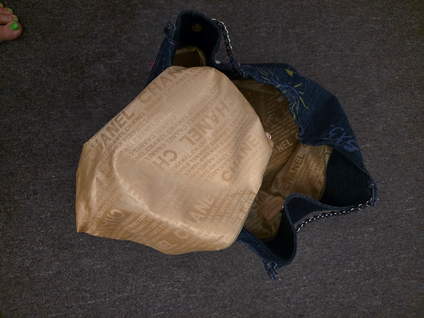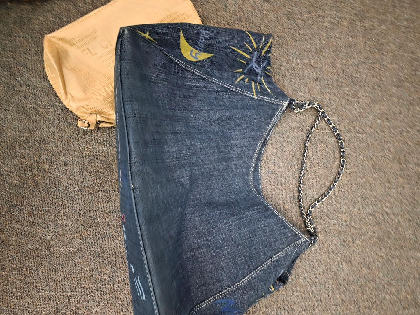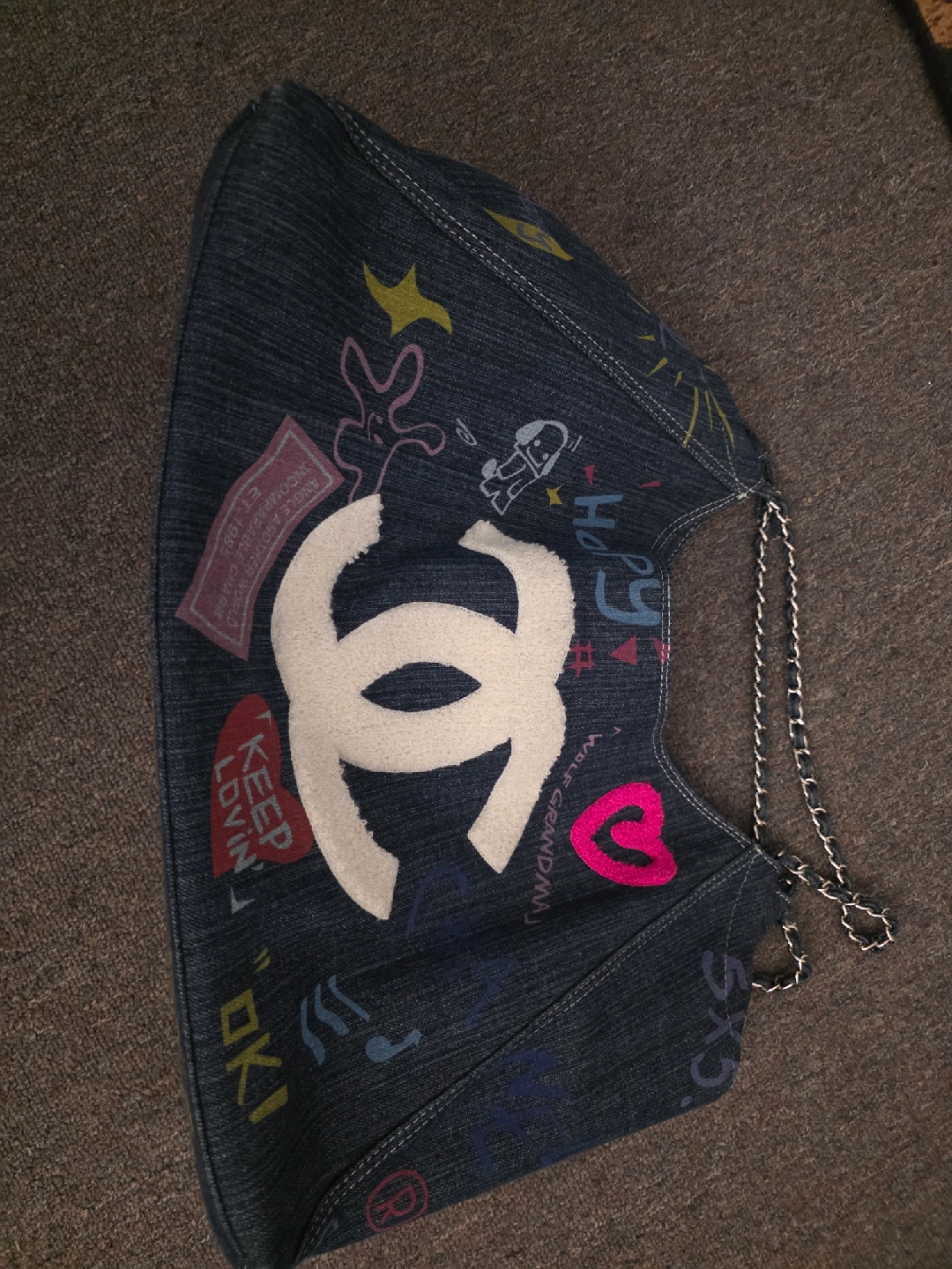 Denim Chanel tote bag with silver chain. It has a beige interior lining with Chanel logos. The bag has some cute designs on it!