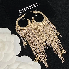 Selling a pair of Chanel gold dangle earrings with box and dust bag that are brand new! These earrings feature a hoop design with multiple chains dangling, each adorned with the iconic Chanel logo. Perfect for adding a touch of elegance to any outfit.
