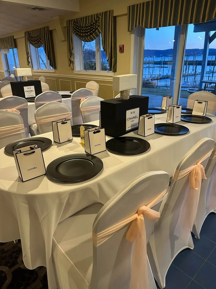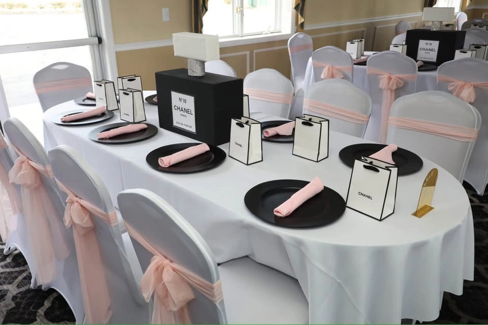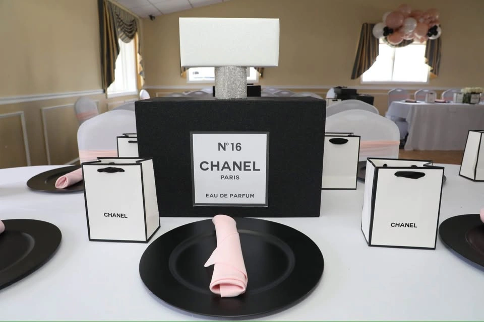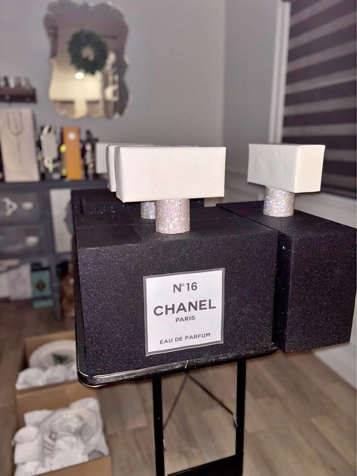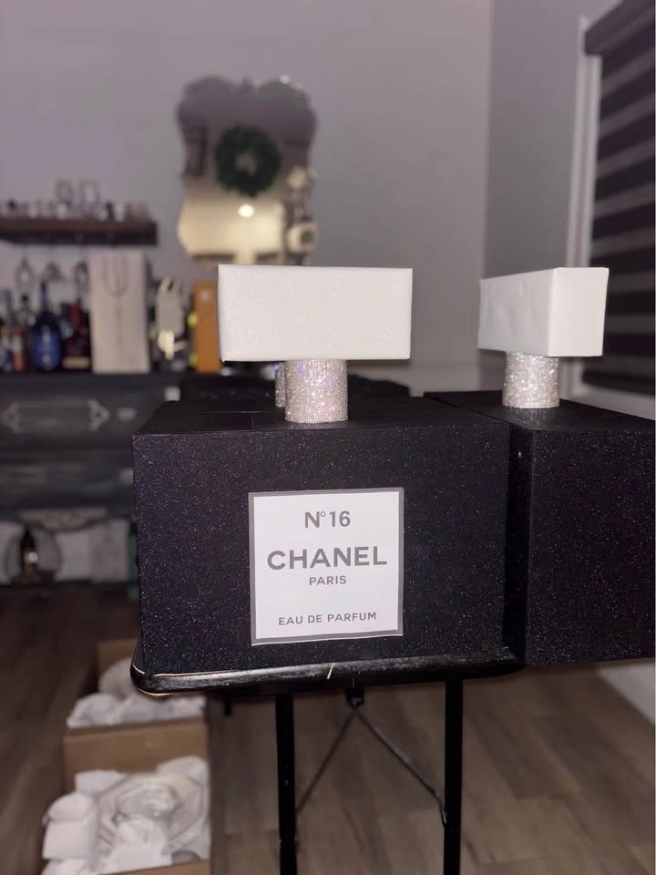 Bring high-fashion elegance to your event with these handcrafted, Chanel No.16-inspired centerpieces. Designed with premium materials and careful attention to detail, each centerpiece captures the iconic sophistication of Chanel. Details: • Large 11”x17”x7” base, wrapped in shimmering black sparkle car wrap • Glittered cylinder “neck” with a crisp white cap • Custom high-quality vinyl logo for a realistic designer finish • Handmade with love and craftsmanship Perfect for: • Bridal showers • Fashion-themed parties • Milestone birthdays • Luxury brand events $100 each Final sale only (no rentals). Local pickup. These pieces are ready to go — no wait time needed! Add a couture statement to your next event — once they’re gone, they’re gone!