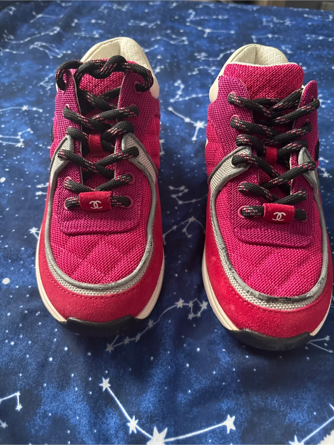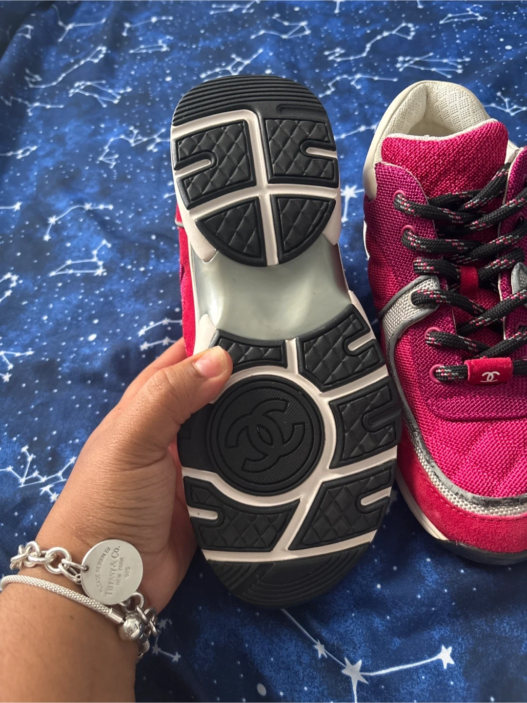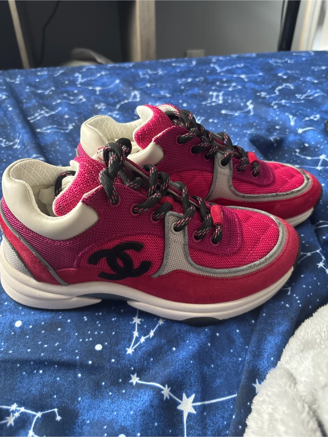 65Selling a pair of Chanel sneakers in pink! They feature the classic Chanel logo and a stylish design. These sneakers are perfect for adding a touch of luxury to your casual outfits