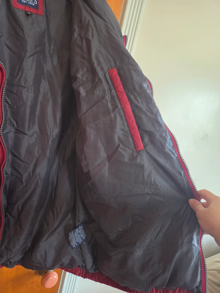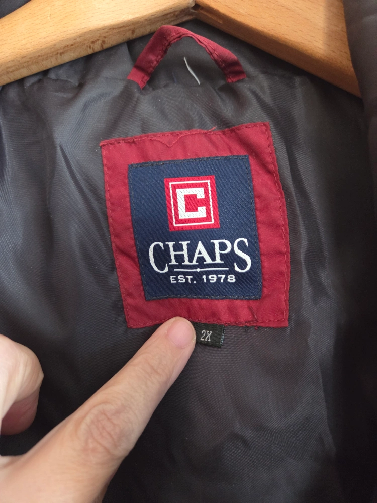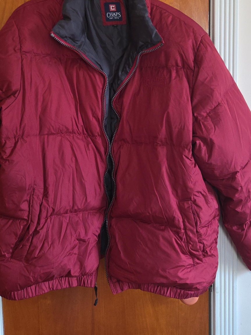 I'm selling a maroon puffer jacket from Chaps. It's a size 2X and has a full zipper. This jacket is perfect for keeping warm on chilly days!