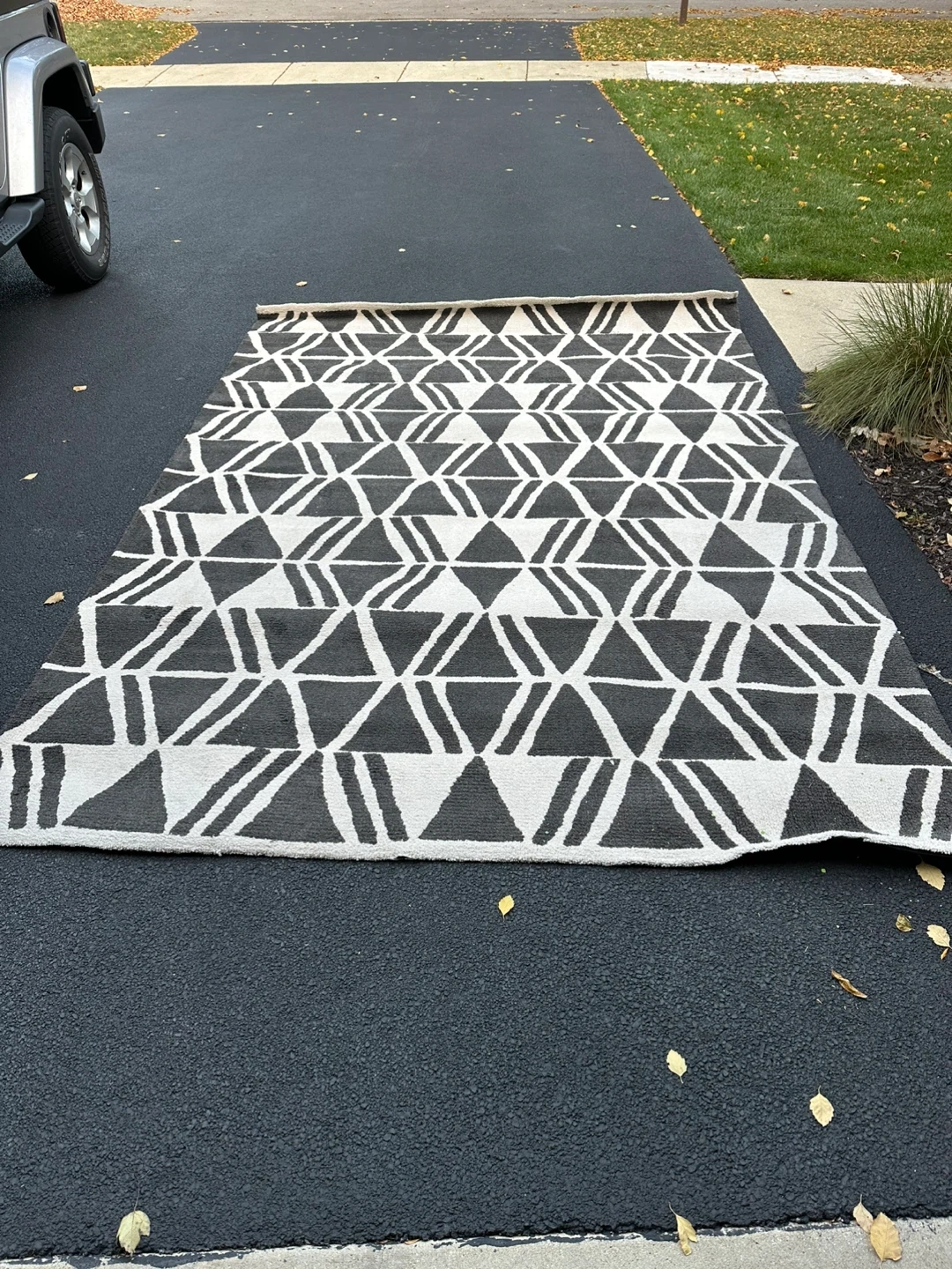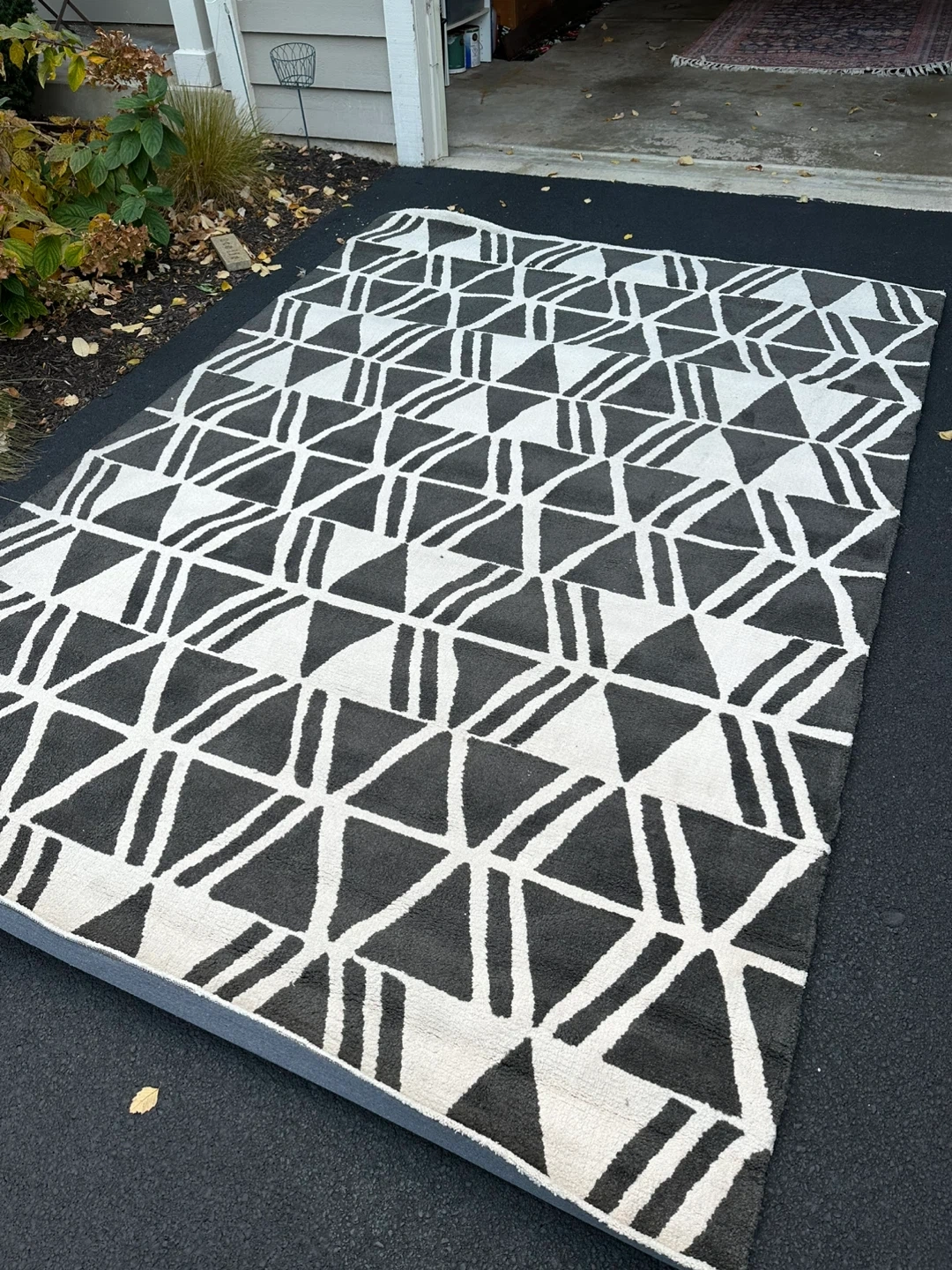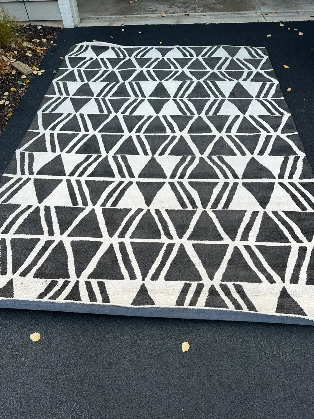 5Here's a stylish grey and white patterned area rug that could really tie a room together! It's in great shape and hardly worn.