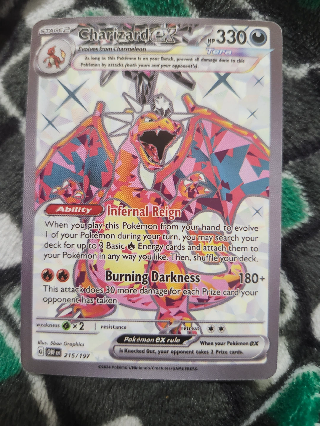 Selling a Charizard ex Tera Pokemon card. It has the ability Infernal Reign and the attack Burning Darkness. This card evolves from Charmeleon and has 330 HP. Illus. Sban Graphics G OBF 215/197. ©2024 Pokémon/Nintendo/Creatures/GAME FREAK