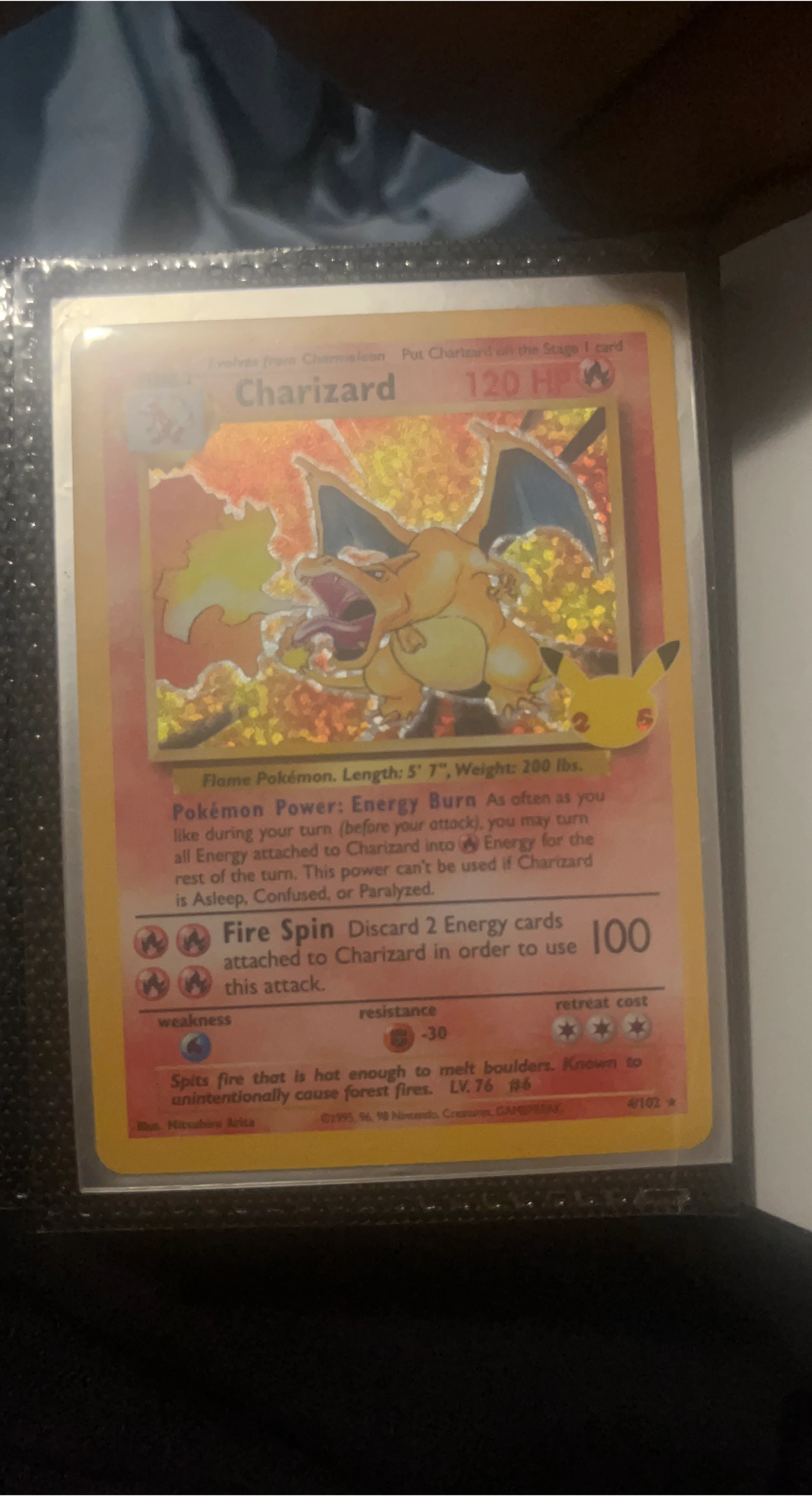 Selling a Charizard Pokemon card. It's a Flame Pokemon with a length of 5'7" and a weight of 200 lbs. It has a Fire Spin attack that discards 2 energy cards attached to Charizard in order to use this attack for 100 damage