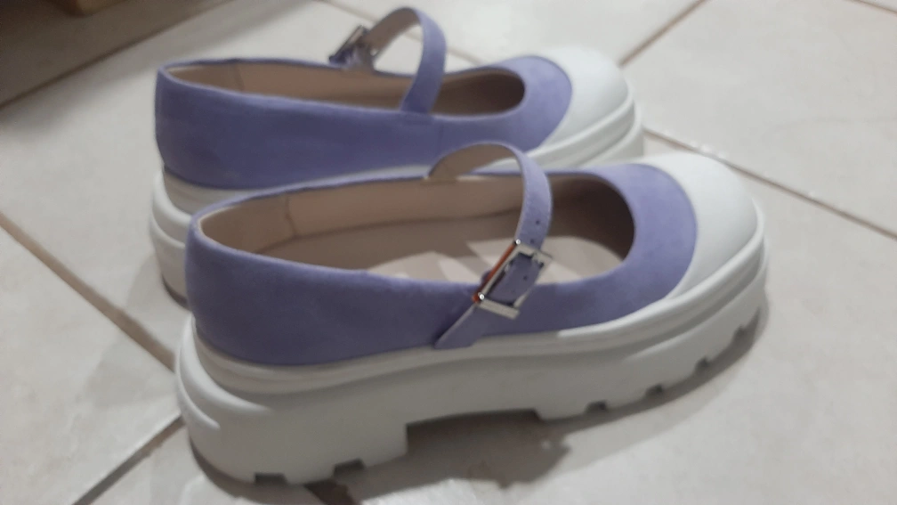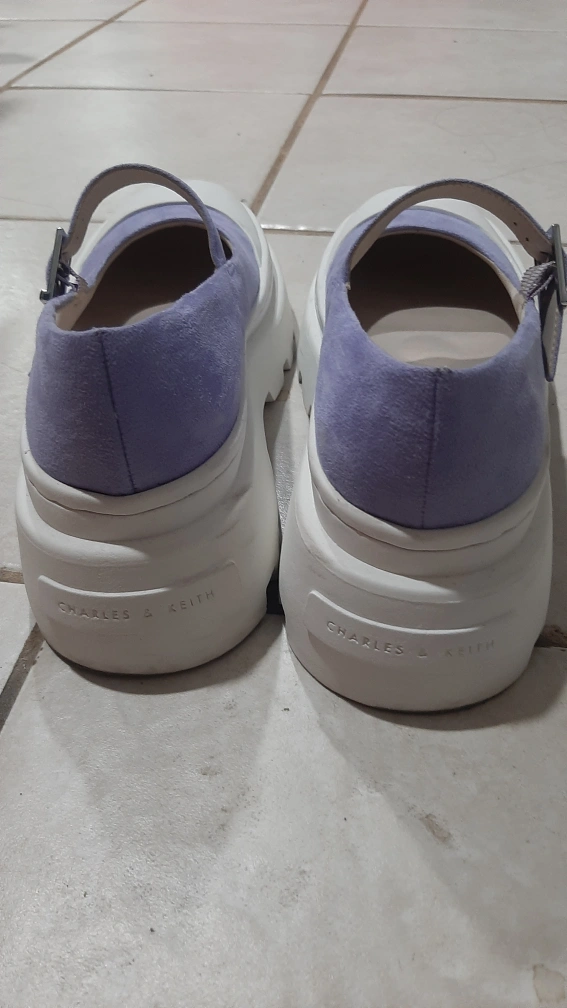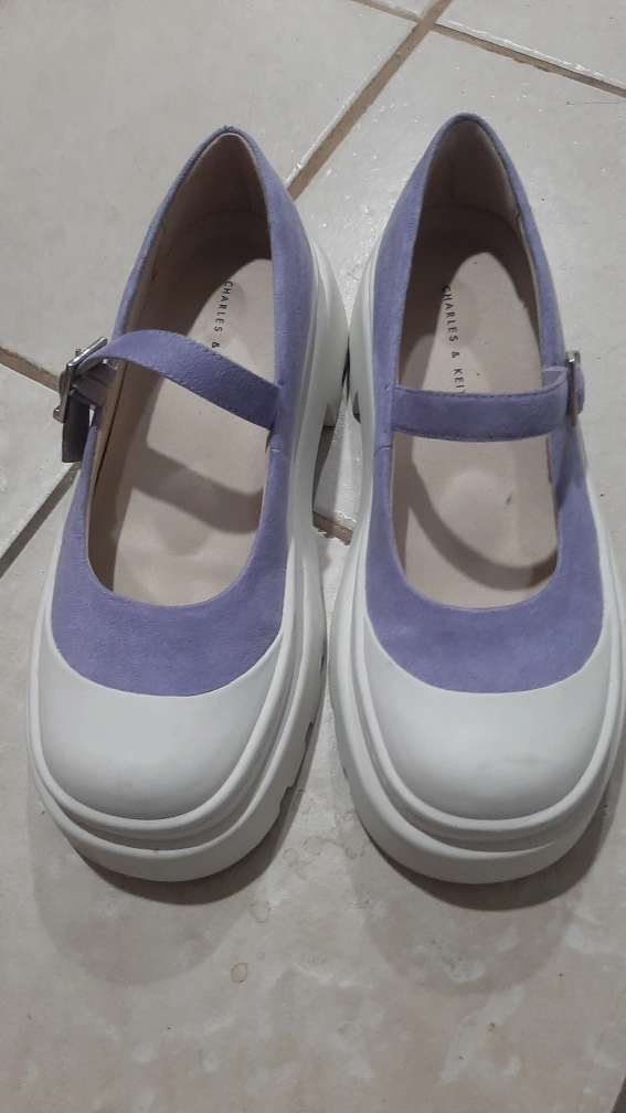 These Charles & Keith platform Mary Janes are super cute and in great condition! They feature a chunky platform sole and a stylish strap. The shoes are a lovely lavender and white color, perfect for adding a pop of color to your outfit. Size 8.