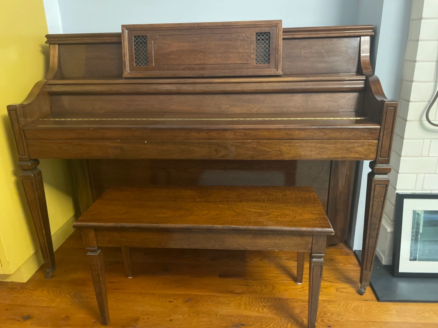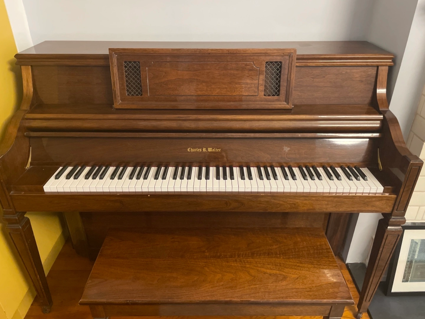 A beautiful wooden piano. Features a full keyboard and a matching bench. The wood has a glossy finish. Perfect for playing beautiful music.