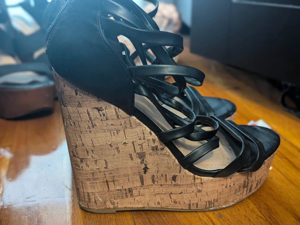 155Women's black wedge sandals with a cork wedge. The sandals have a zipper in the back.