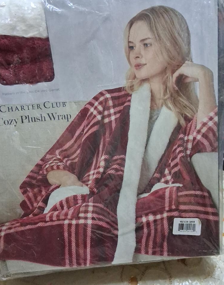 Selling a Charter Club Cozy Plush Wrap! It features a cozy design with a plush lining. The wrap has a plaid pattern in red and white. Perfect for staying warm and comfortable!