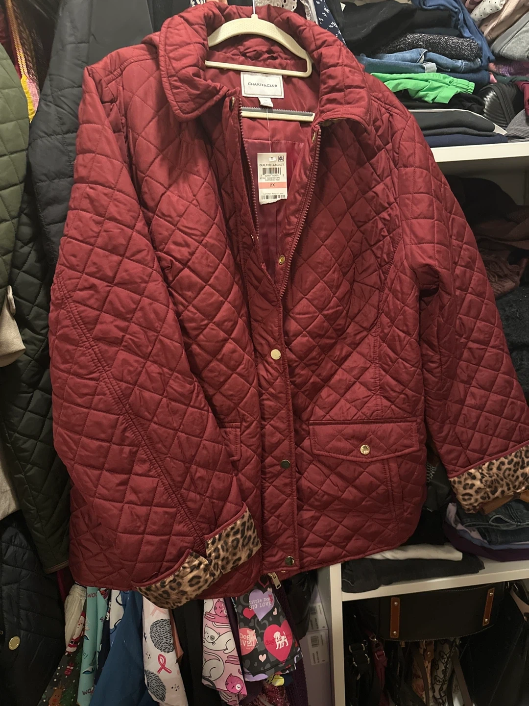 60Selling a beautiful Charter Club quilted jacket in burgundy! This jacket is a size 2X and features a stylish quilted pattern. The cuffs have a fun leopard print detail. It's in great condition and ready for a new home!