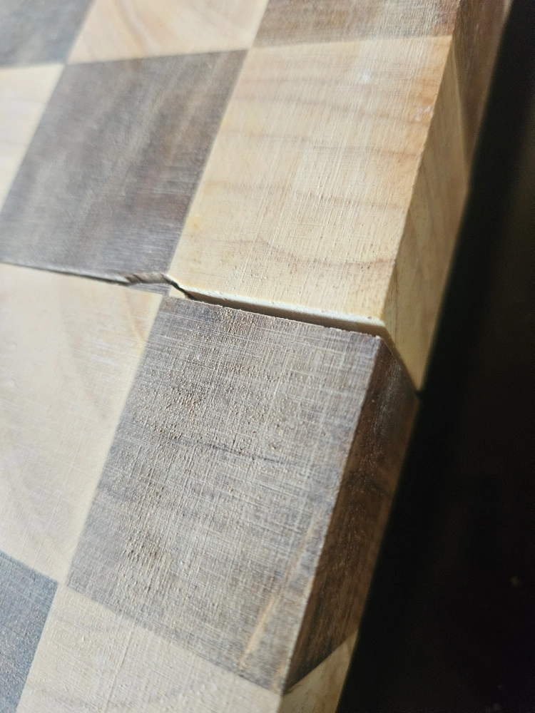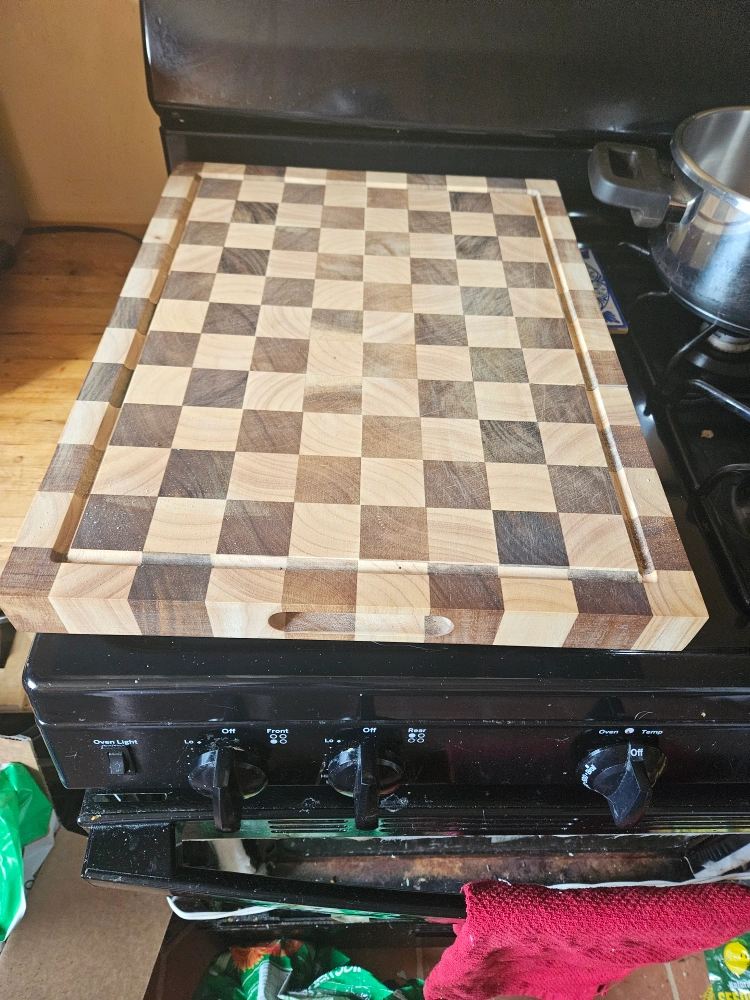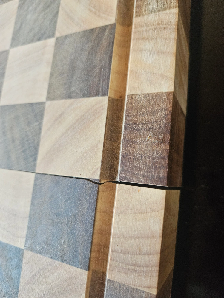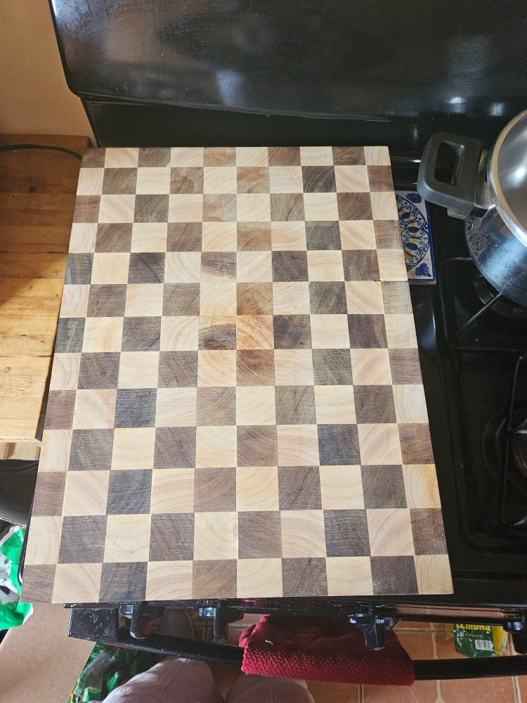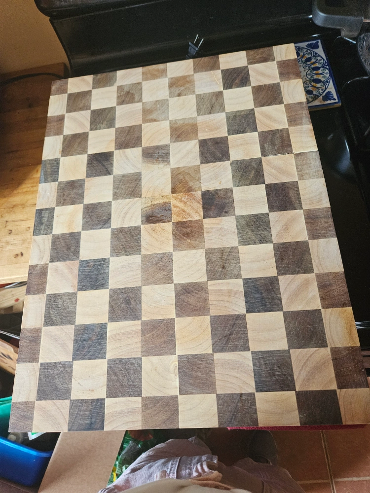Selling a wooden cutting board with a checkerboard pattern. It has a groove around the edge and handles on the sides. There is a small crack on the side otherwise firmly stable.