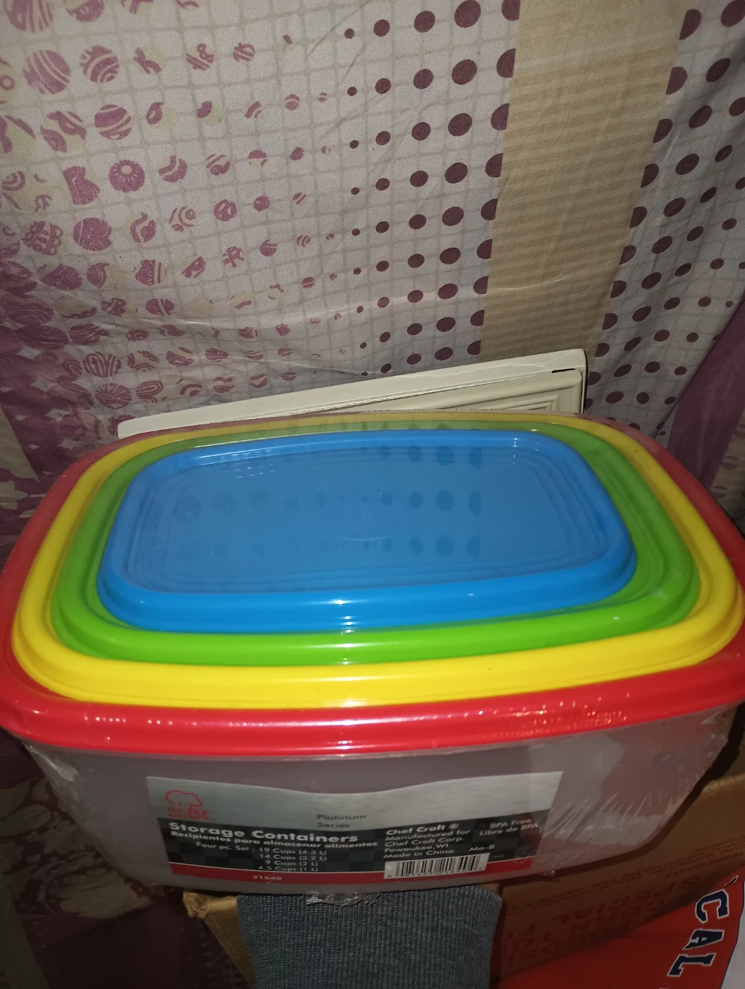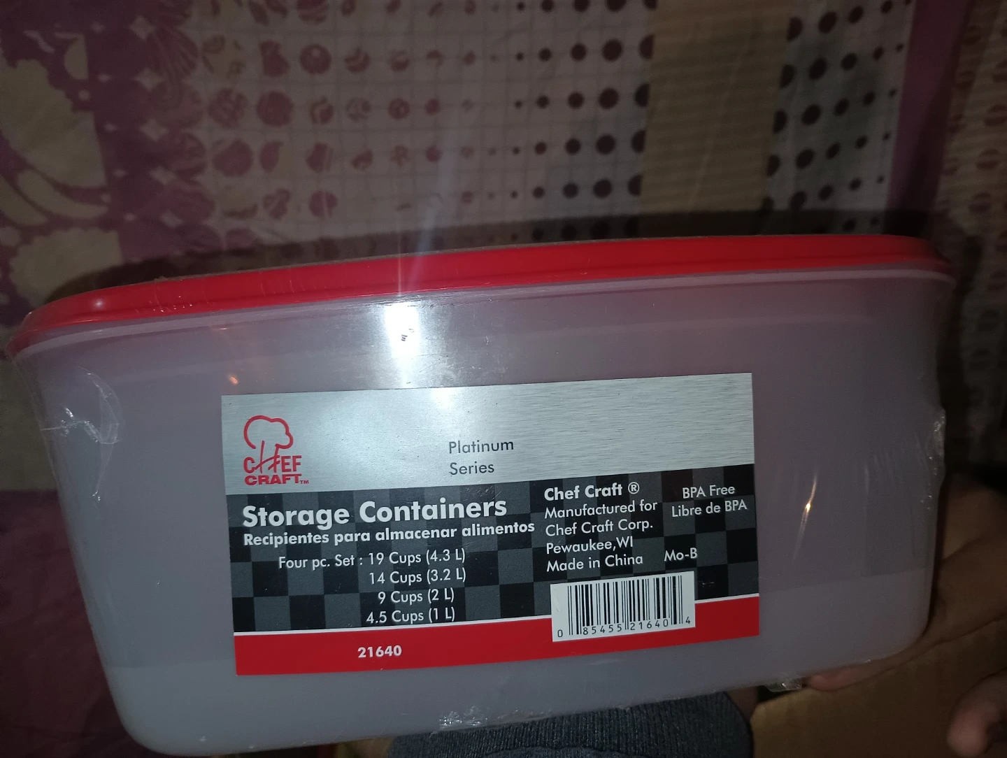 12This is a Chef Craft Platinum Series Storage Containers, a four-piece set. The set includes containers of the following sizes: 19 cups (4.3 L), 14 cups (3.2 L), 9 cups (2 L), and 4.5 cups (1 L). They are BPA free
