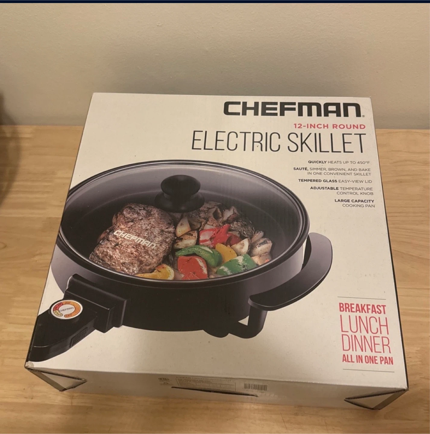 10Selling a Chefman 12-inch round electric skillet! It quickly heats up to 450°F, and you can sauté, simmer, brown, and bake in one convenient skillet. It has a tempered glass easy-view lid and an adjustable temperature control knob. This large capacity cooking pan is perfect for breakfast, lunch, and dinner. Box included