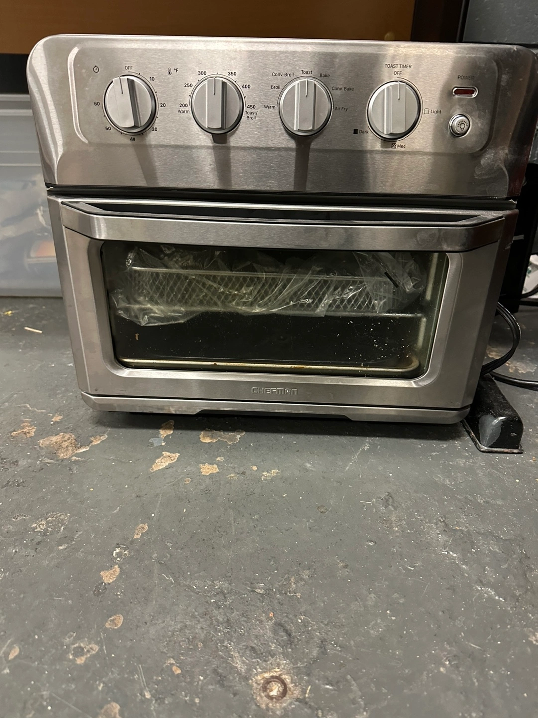 Stainless steel air fryer toaster oven. Multiple cooking functions: air fry, bake, toast, broil, convection bake, and warm. Digital controls and timer.