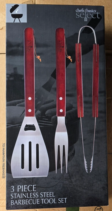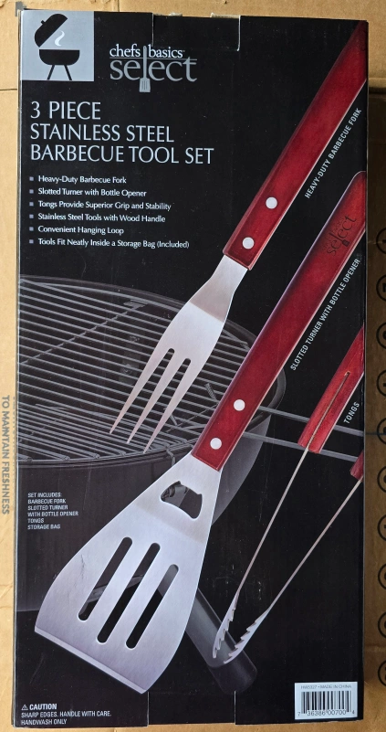 New in box. Three-piece barbecue tool set. Includes spatula, fork, and tongs. Stainless steel with wood handles. Convenient storage bag included.