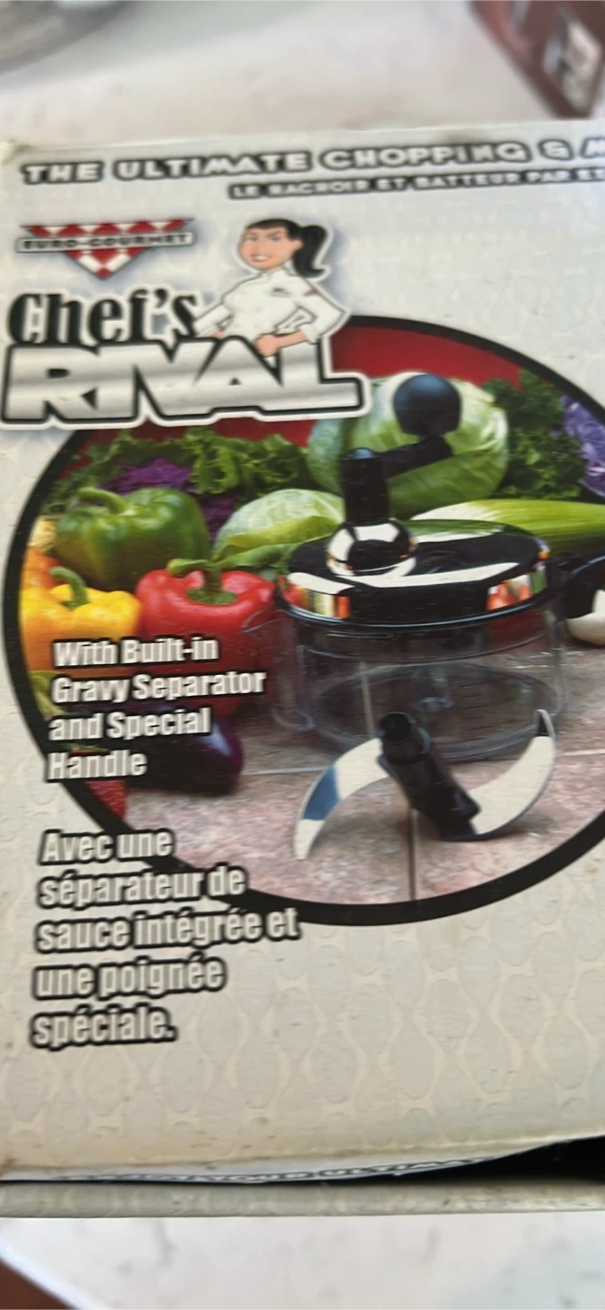 I'm selling a Chef's Rival Ultimate Chopping & Mixing Machine. It features a built-in gravy separator and special handle. It also has master cut 2 blades.