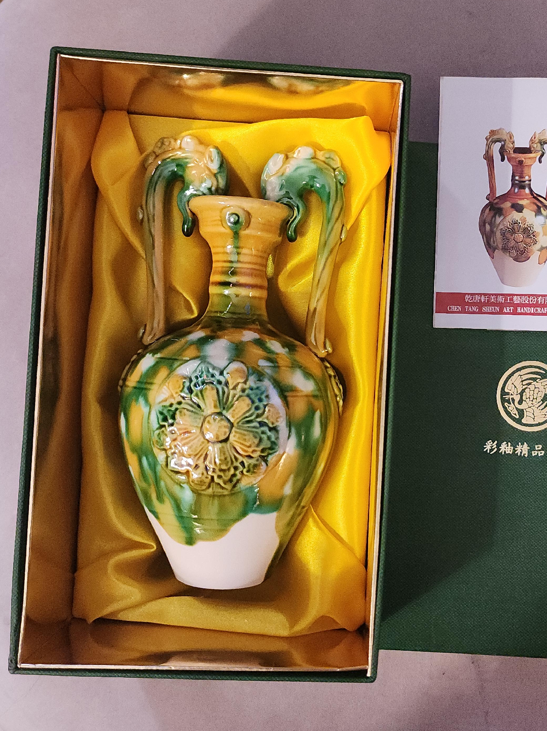 Here's a beautiful Chen Tang Sheun Art Handcraft vase! It comes with its original box. The vase has a unique design with dragon-shaped handles and a floral pattern. It measures about 8 inches tall. original price was $1,500
