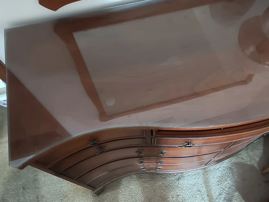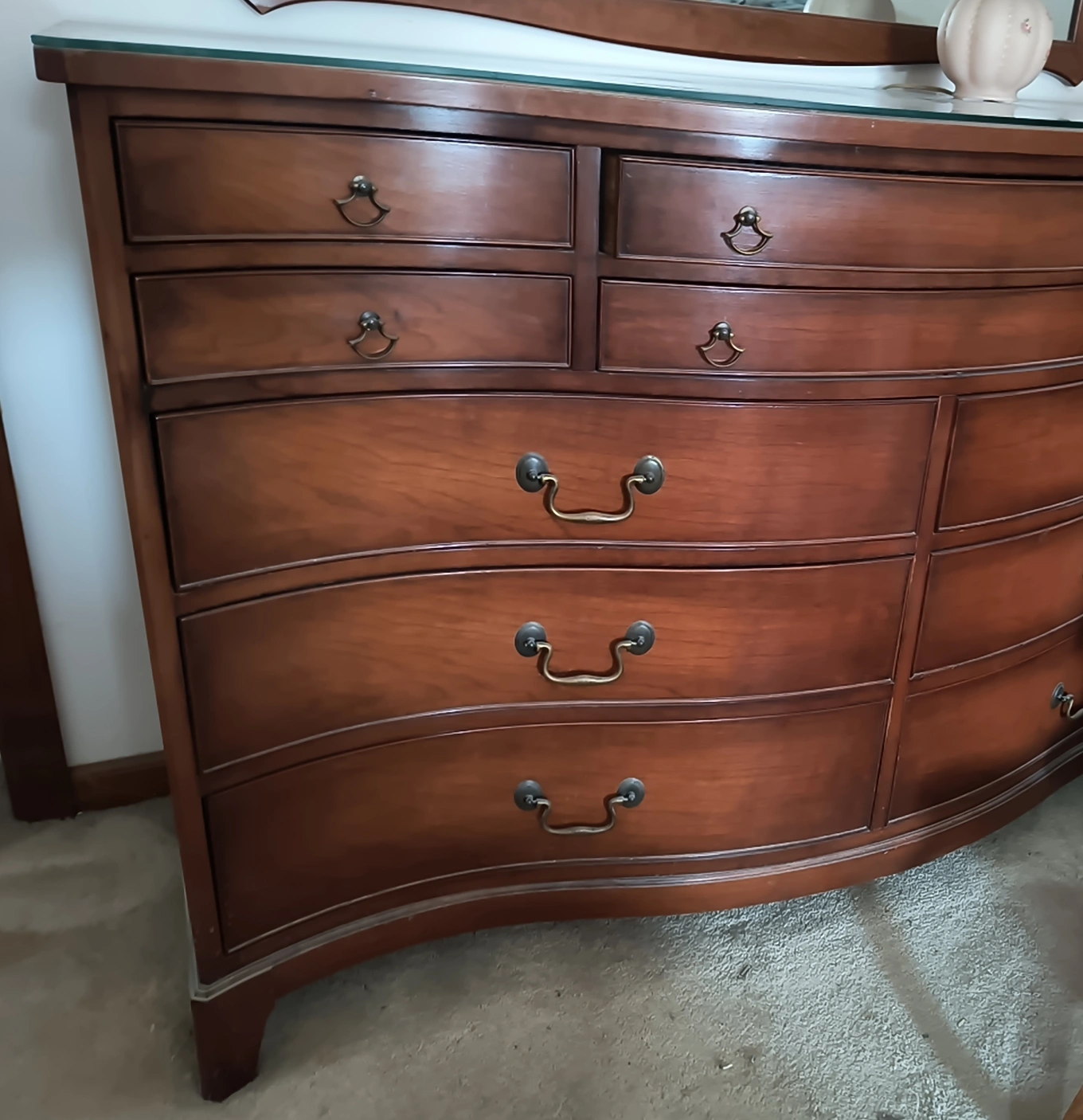Selling a beautiful cherrywood dresser with glass top & mirror. It features a curved-front design and antique-style handles. The dresser has multiple drawers for ample storage.