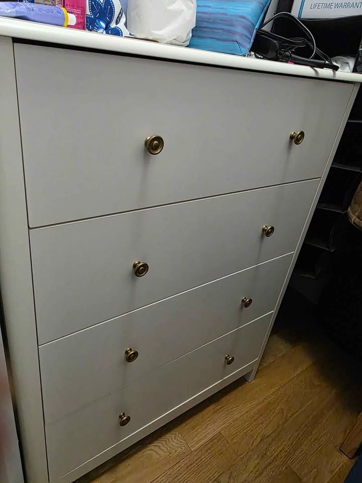 10Dimensions: 29.5 in length, 15.5 wide, 37 in height White wooden Chest with Drawers. Perfect for clothes or other items. It is in good condition visually, but the drawers don't close properly. They sometimes get stuck or jammed