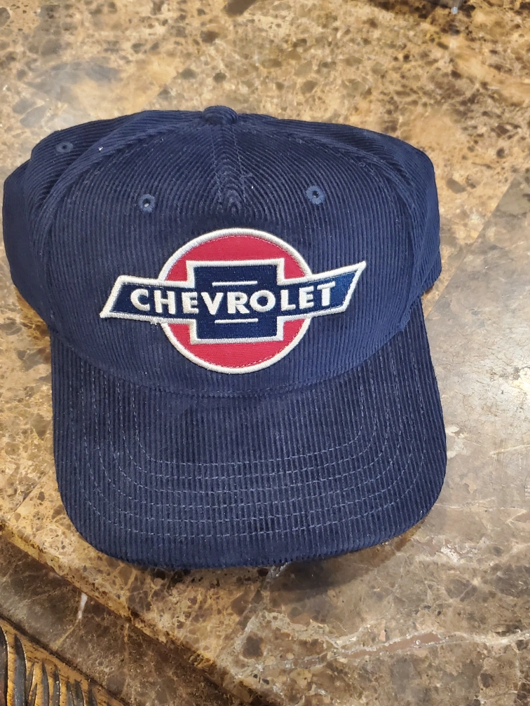 Selling a navy blue Chevrolet corduroy hat. It's in great condition and features the classic Chevrolet logo. Perfect for any car enthusiast! 12 in stock.
