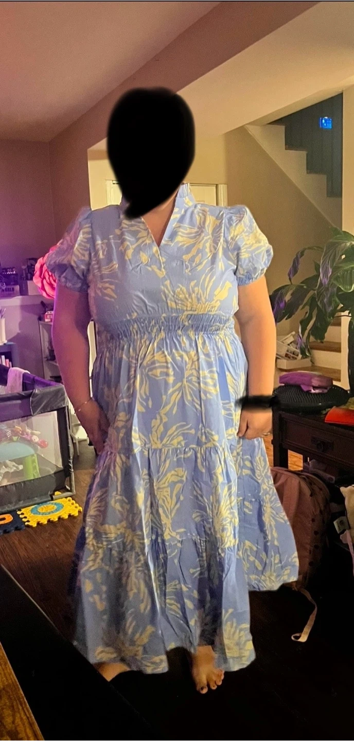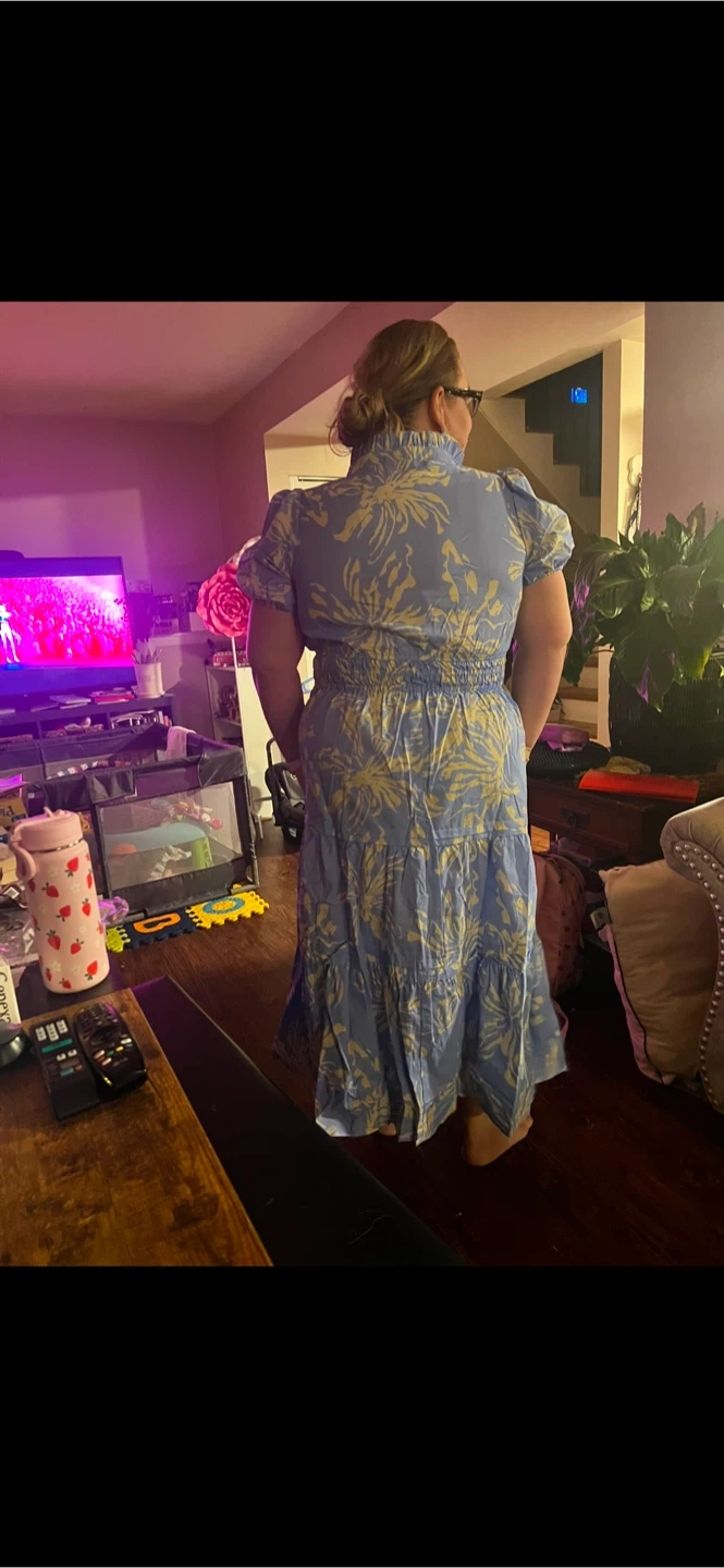 15This is a beautiful floral print dress. It features a light blue background with an off white/ivory leaf pattern. The dress has a tiered skirt and short, puffed sleeves. It's in excellent like new condition and ready for a new home!