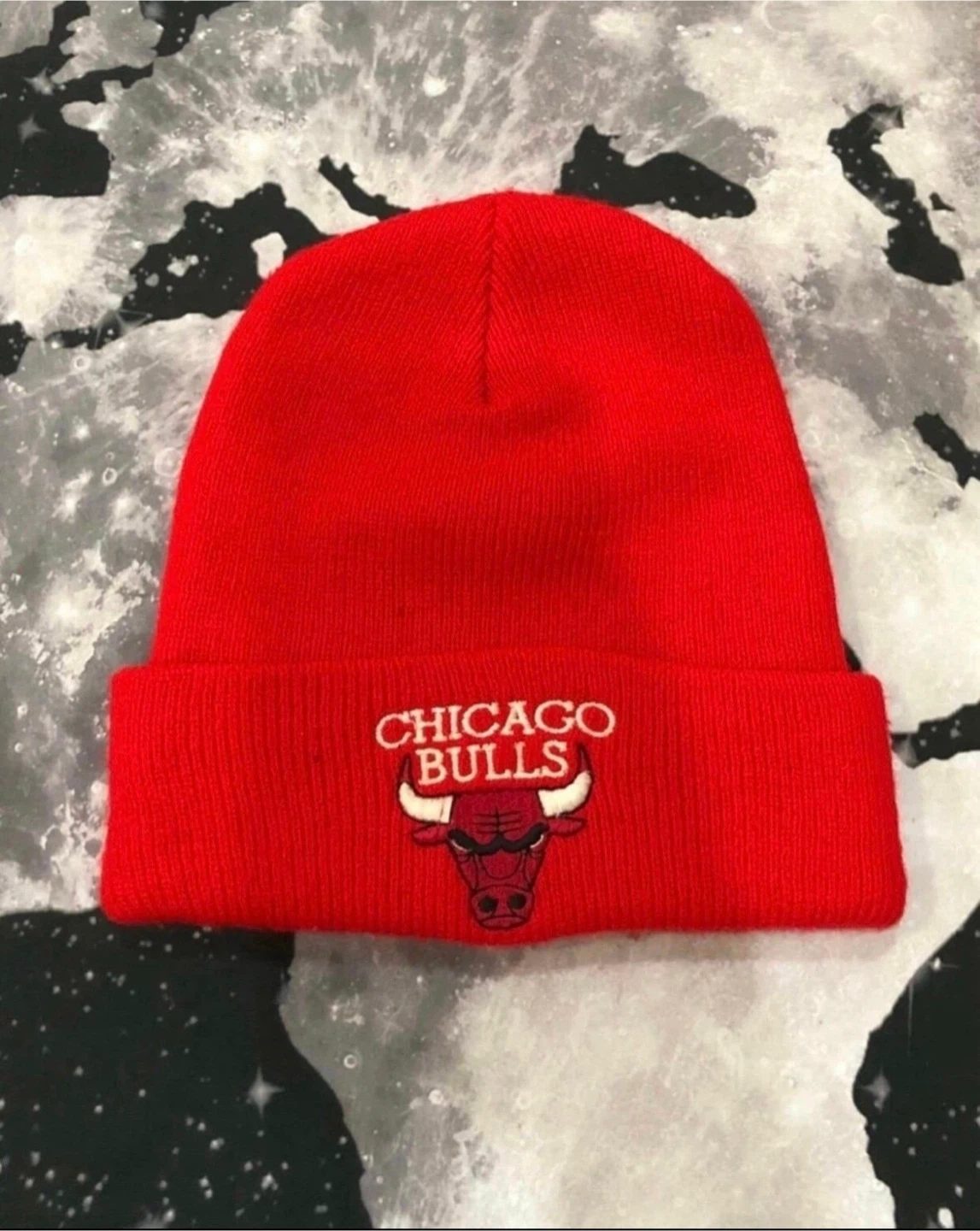 NBA Chicago Bulls skully beanie hat, color is red with front embroidered Basketball team logo.