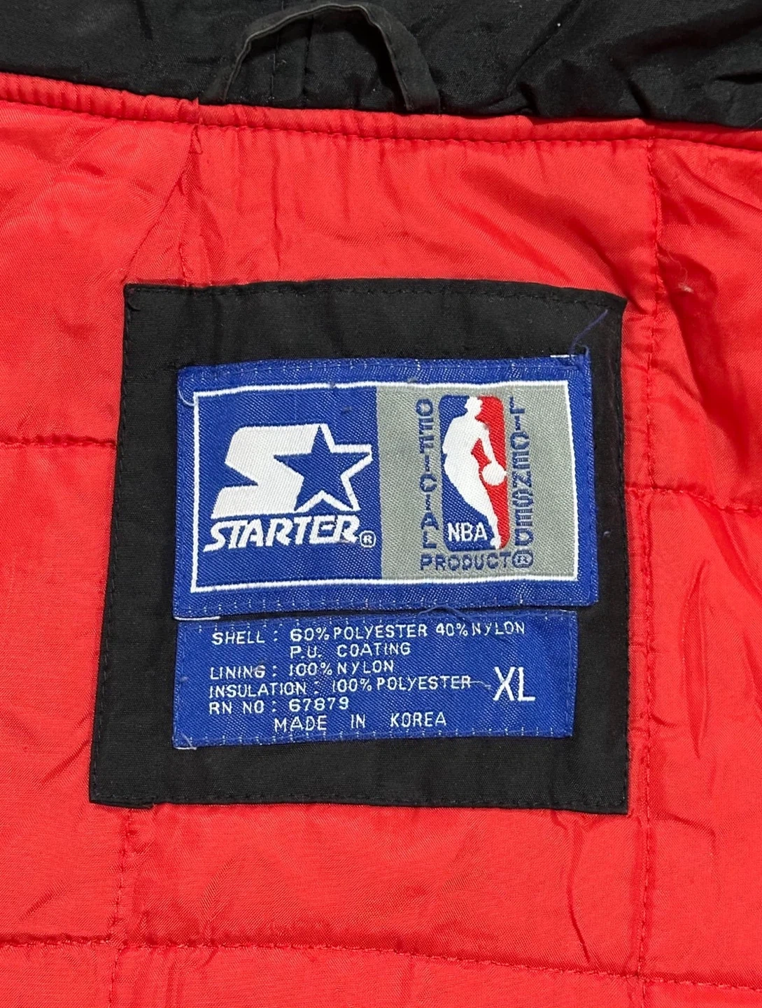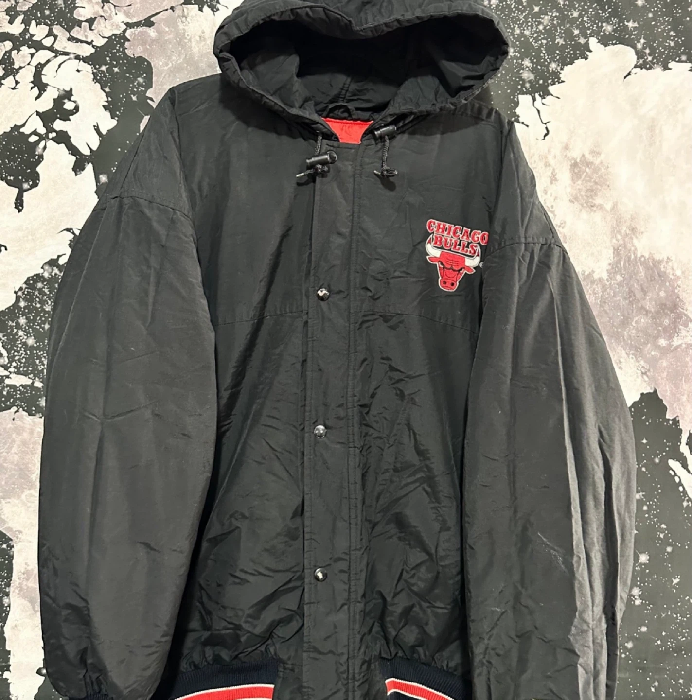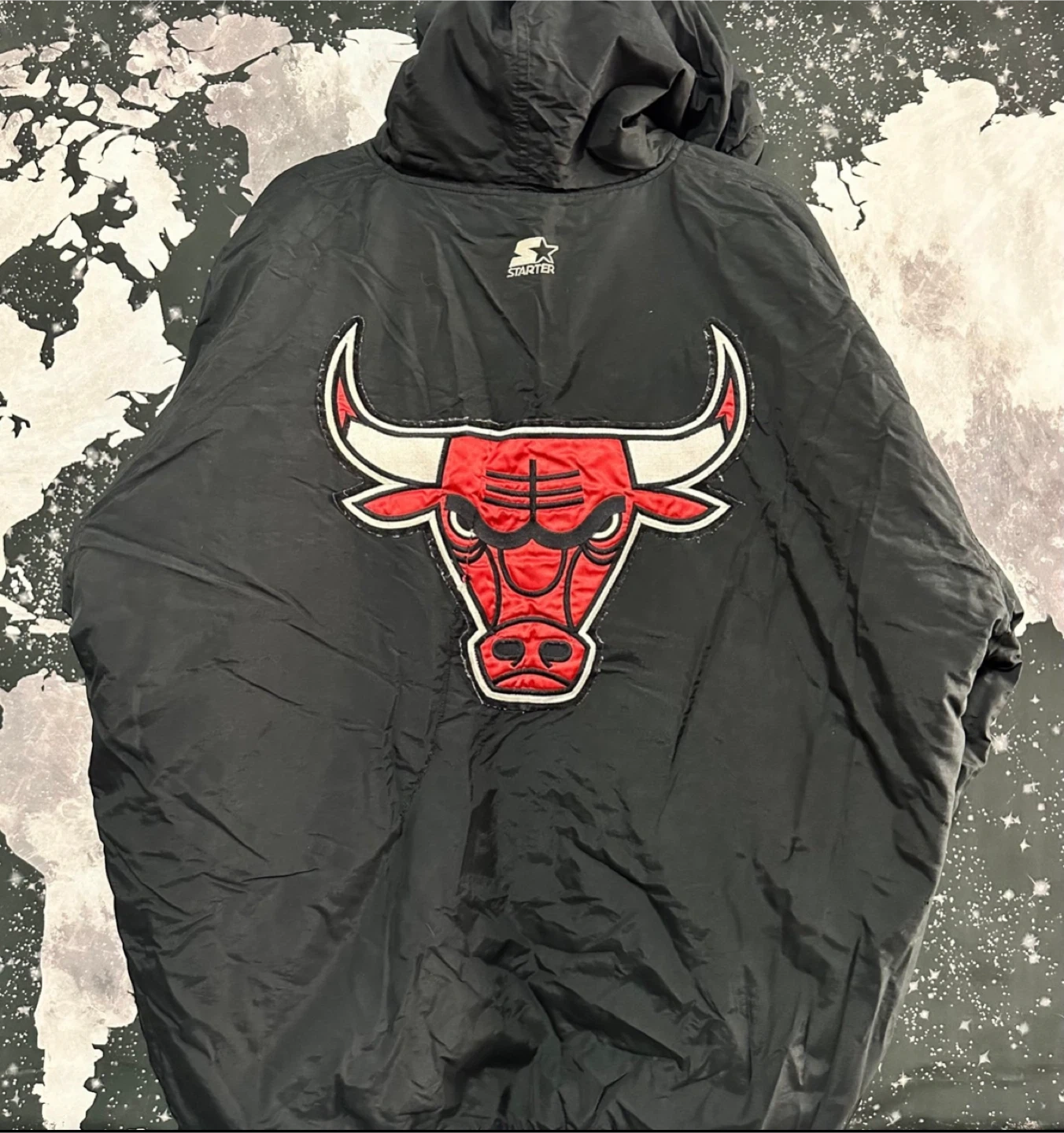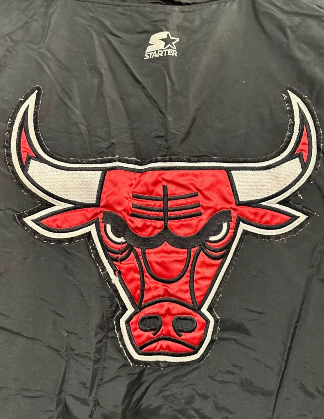 Chicago Bulls NBA Starter oversized baggy style athletic sports basketball team jacket, color is black with embroidered team logo. Preowned condition *line across back patchwork, button paint fade, light general wear* *Fits towards an XXL* Measurements (29”x32”)