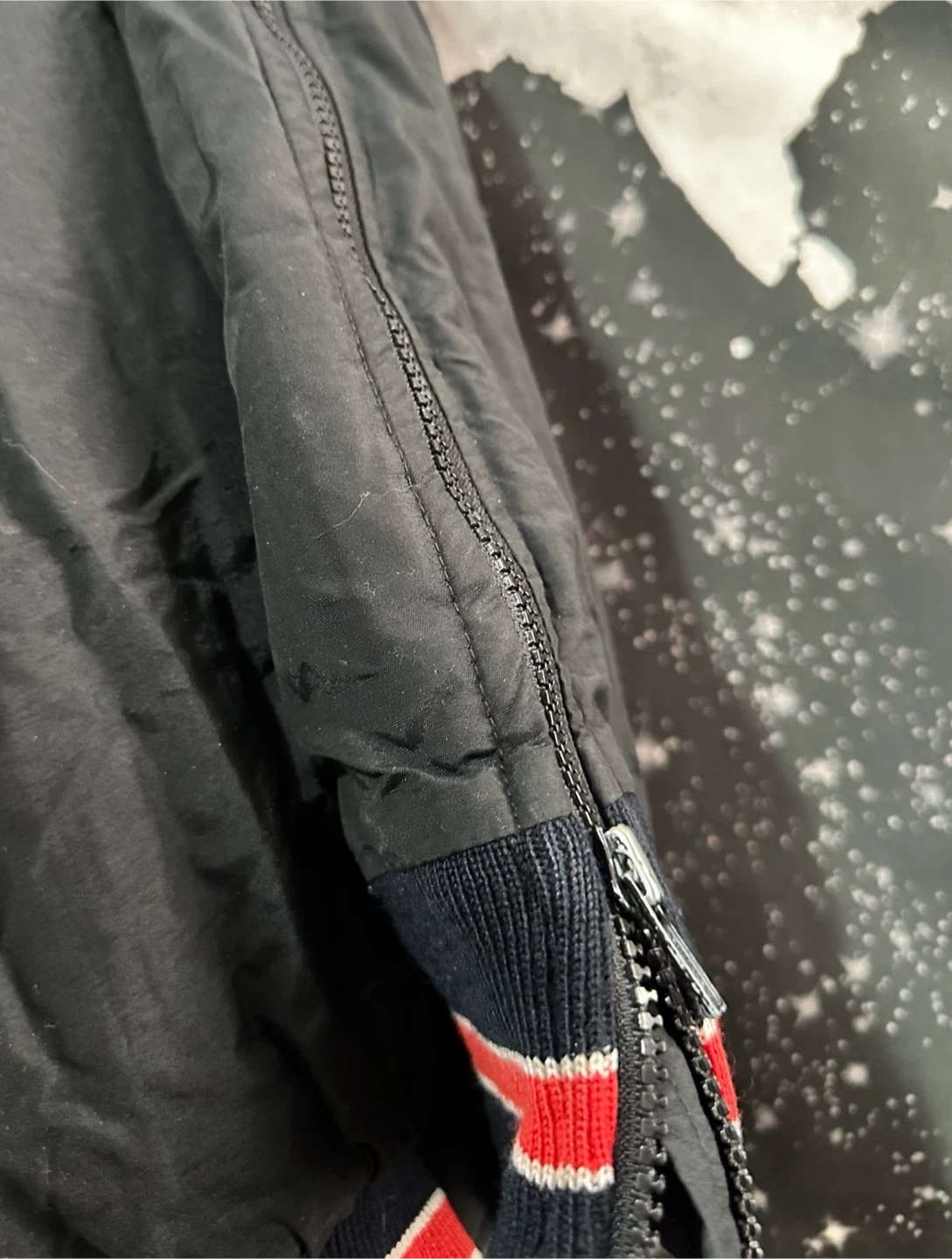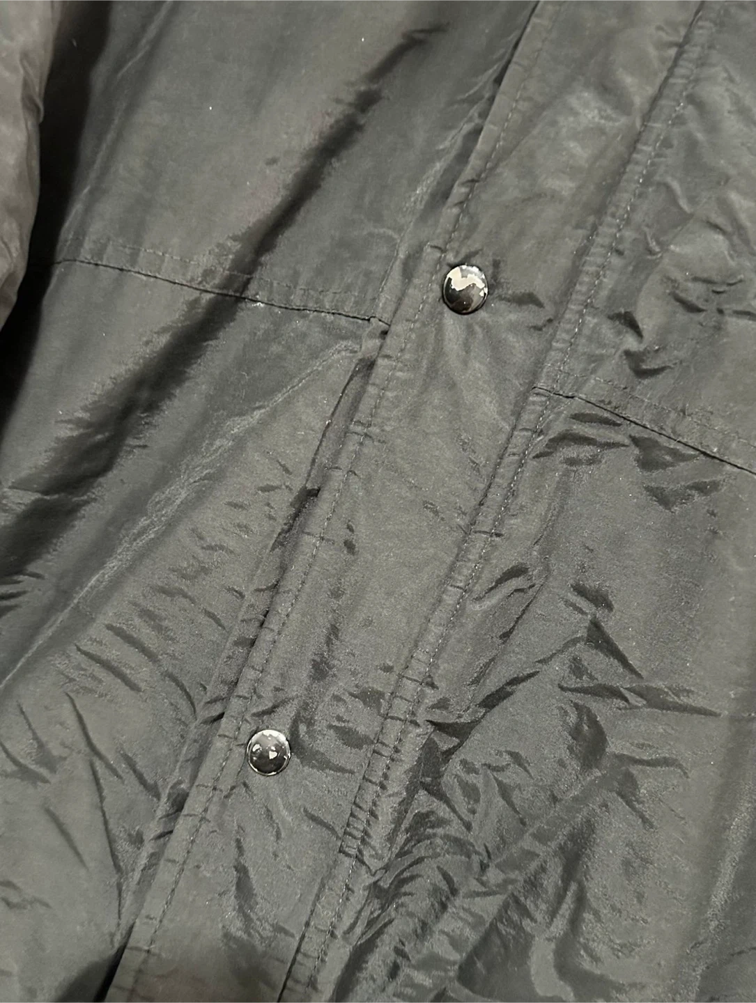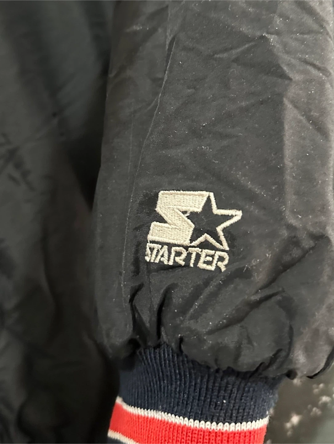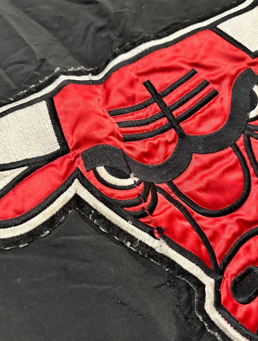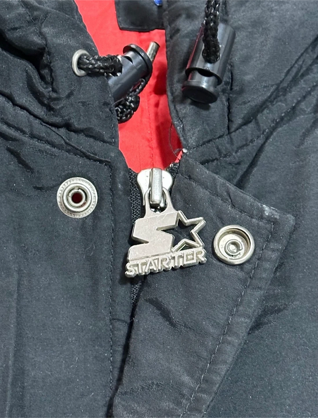 Chicago Bulls NBA Starter oversized baggy style athletic sports basketball team jacket, color is black with embroidered team logo. Preowned condition *line across back patchwork, button paint fade, light general wear* *Fits towards an XXL* Measurements (29”x32”)