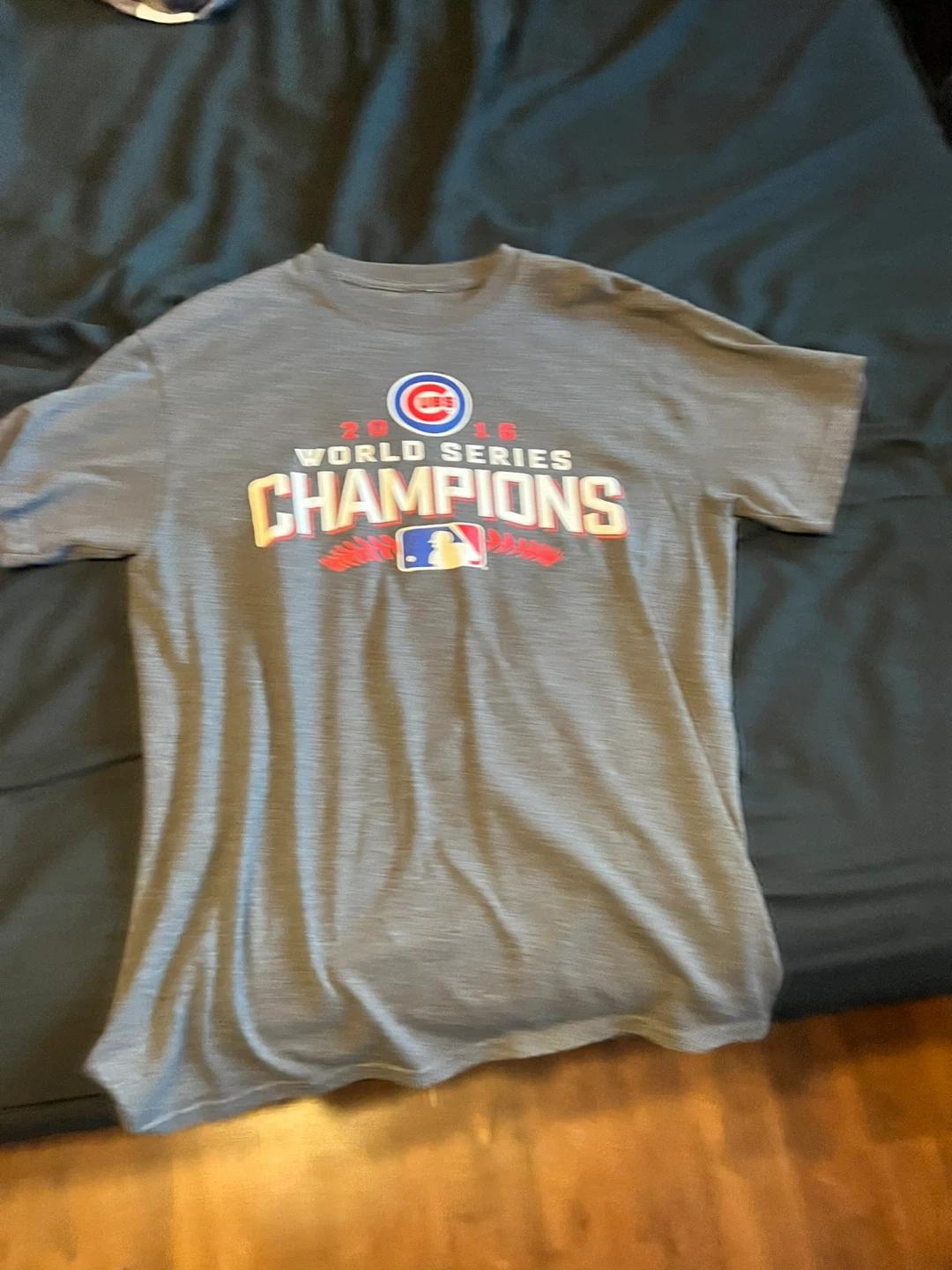 65Selling a Chicago Cubs 2016 World Series Champions T-shirt. It's gray and features the team logo and a list of players from that winning season on the back. Perfect for any Cubs fan!