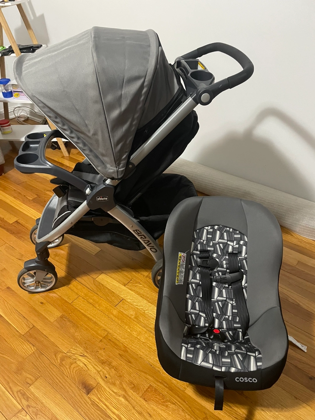 Selling a Chicco Bravo stroller and Cosco car seat! The stroller is in good condition and comes with a convenient parent tray and storage basket. The car seat is also in good condition and ready for your little one's adventures