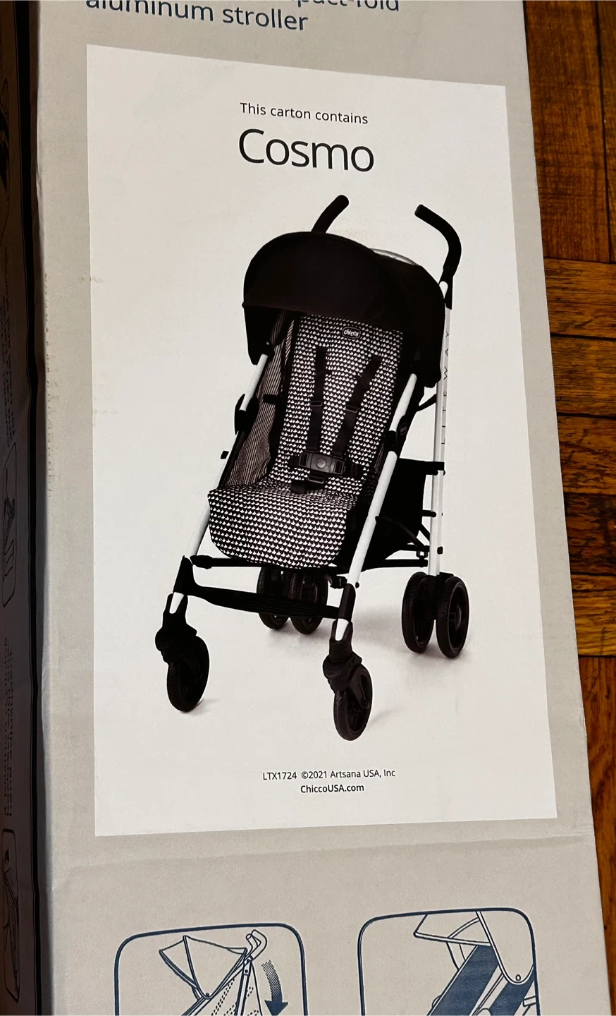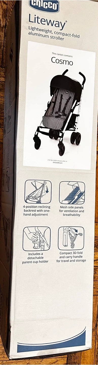Selling a Chicco Liteway lightweight, compact-fold aluminum stroller in the Cosmo design! It features an adjustable leg support for added recline comfort and a compact 3D fold with a carry handle for travel and storage. There's also a storage basket for on-the-go essentials, a 4-position reclining backrest with one-hand adjustment, and mesh side panels for ventilation and breathability. It even includes a detachable parent cup holder! Originally retailed for $109.99