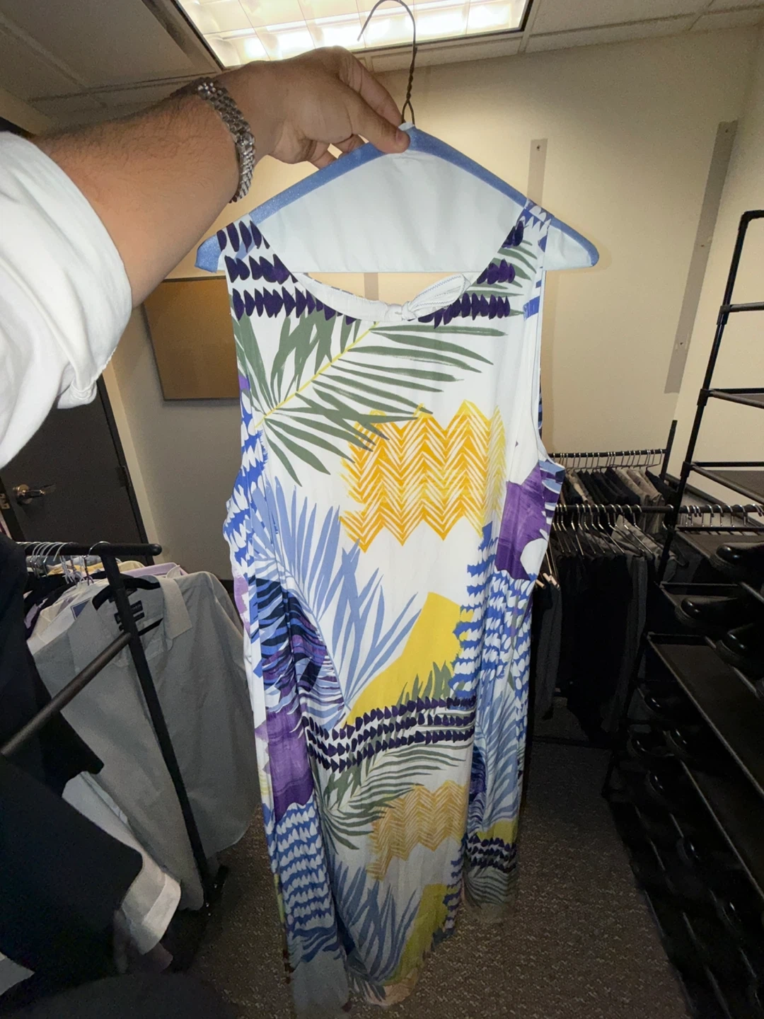 This is a Chico's maxi dress in size 3W. It features a colorful tropical print with blue, green, yellow, and purple hues. Perfect for a summer day!