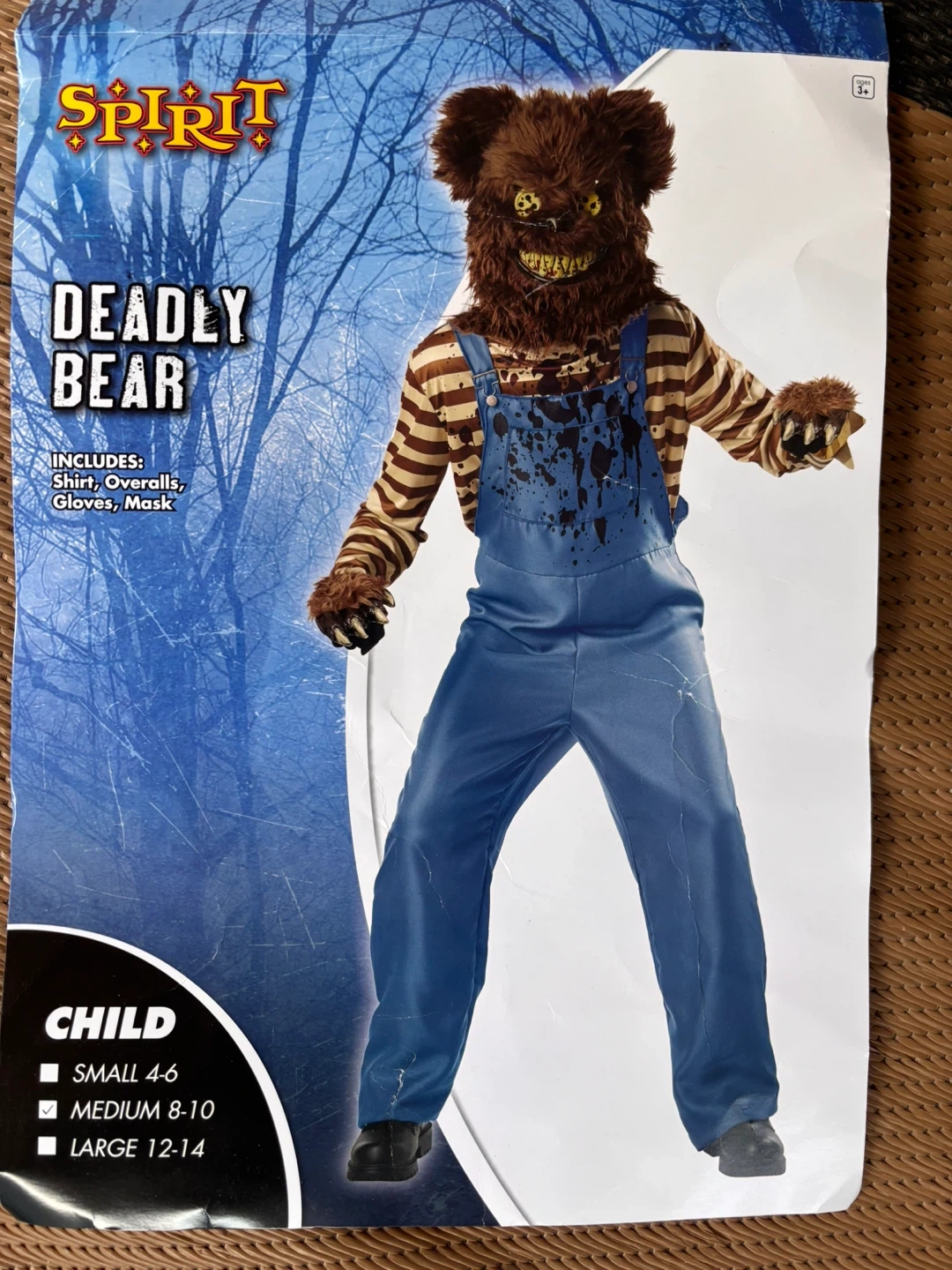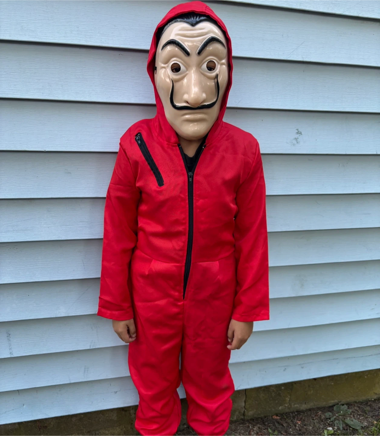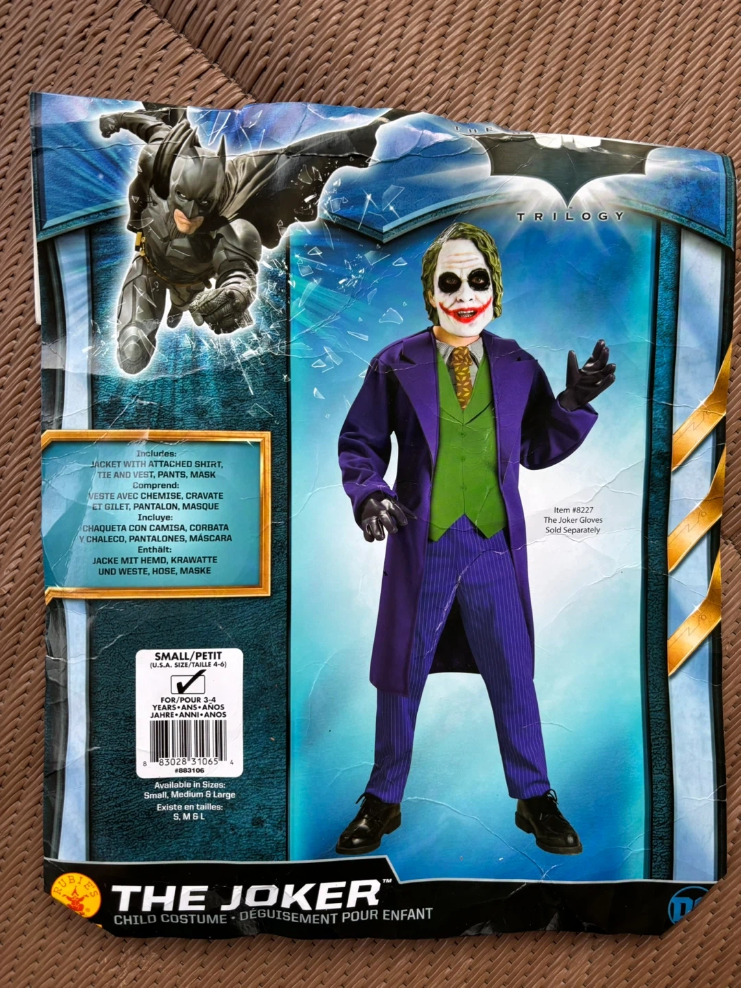 Selling a child's size medium Halloween costume. The packaging shows that it includes the shirt, overalls, gloves, and mask accept for Joker costume has no mask