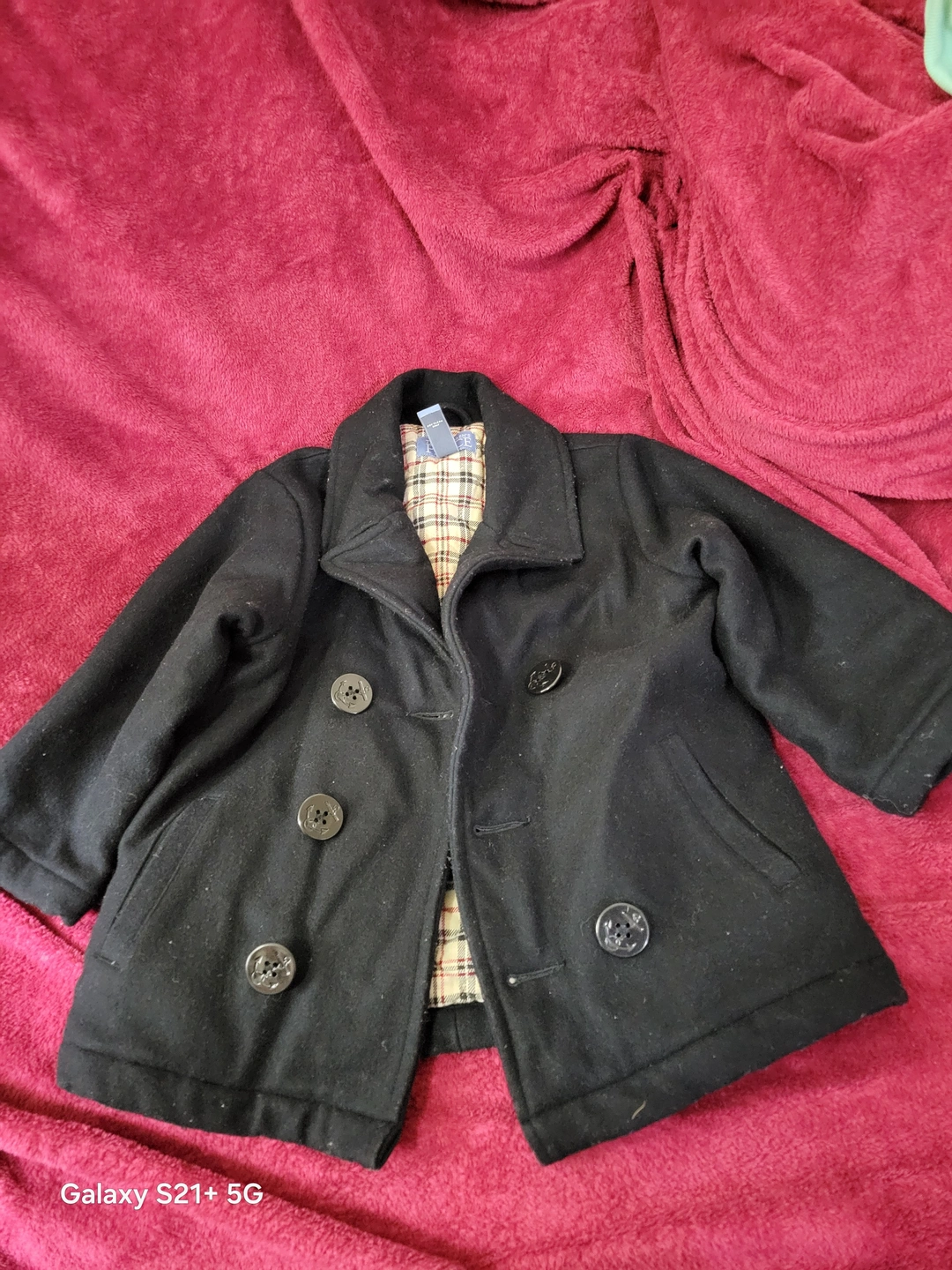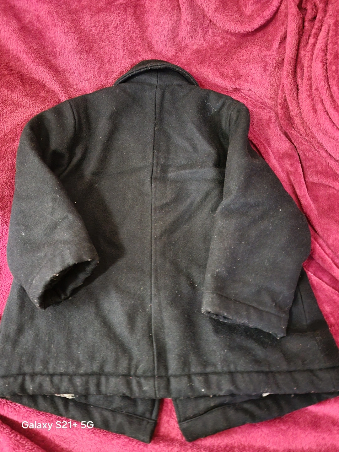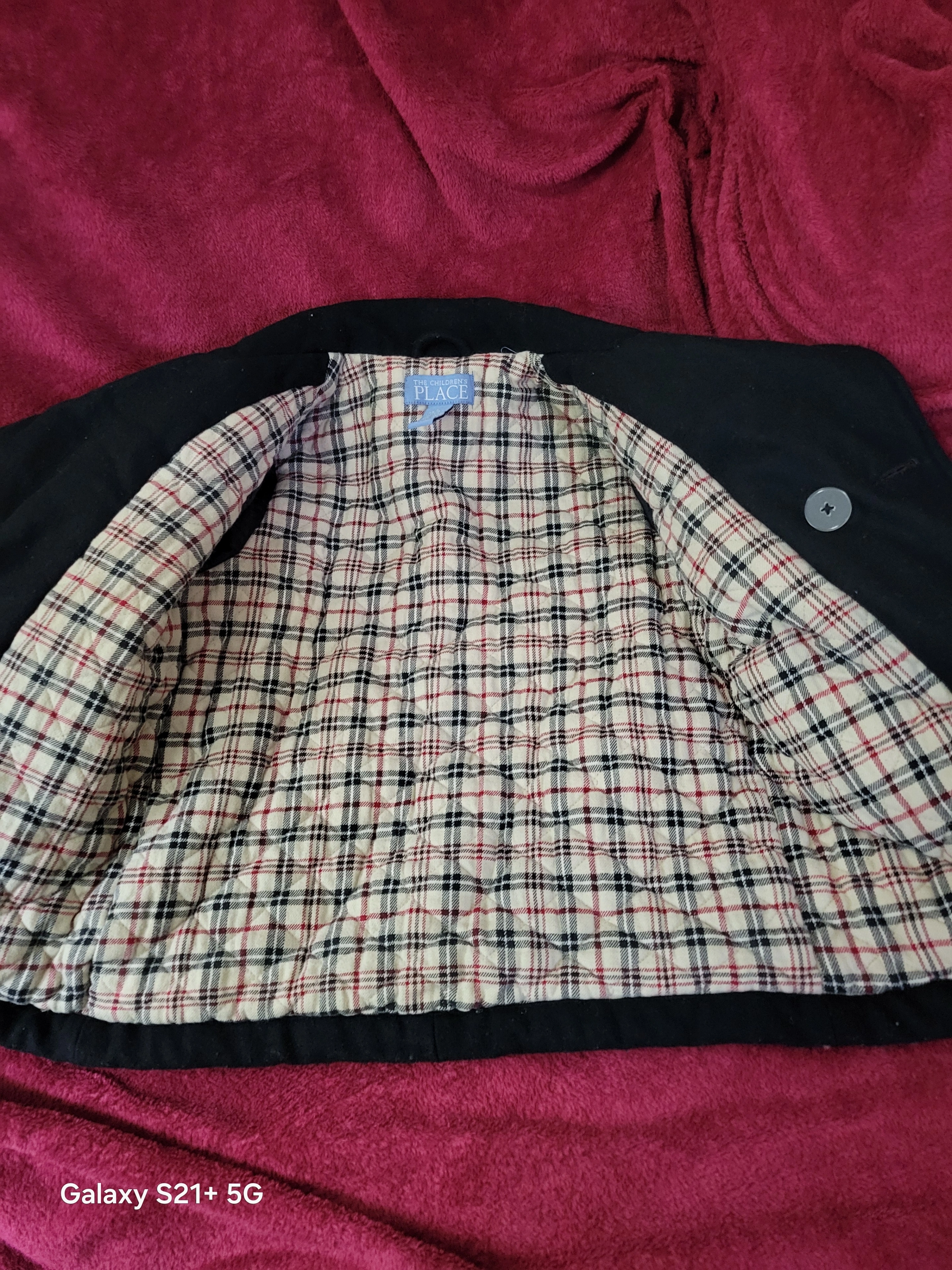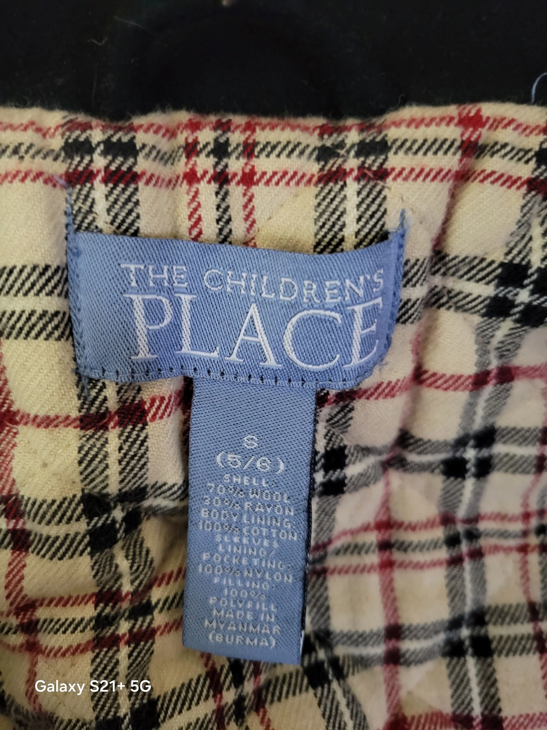 65Gently used Children's Place Boys Pea Coat, Black, Size Small (5/6). Note: My apologies for the grainy photos. Item is reasonably clean not dingy but needs dry cleaning. One decorative button missing. Coat still looks good when seen in person.