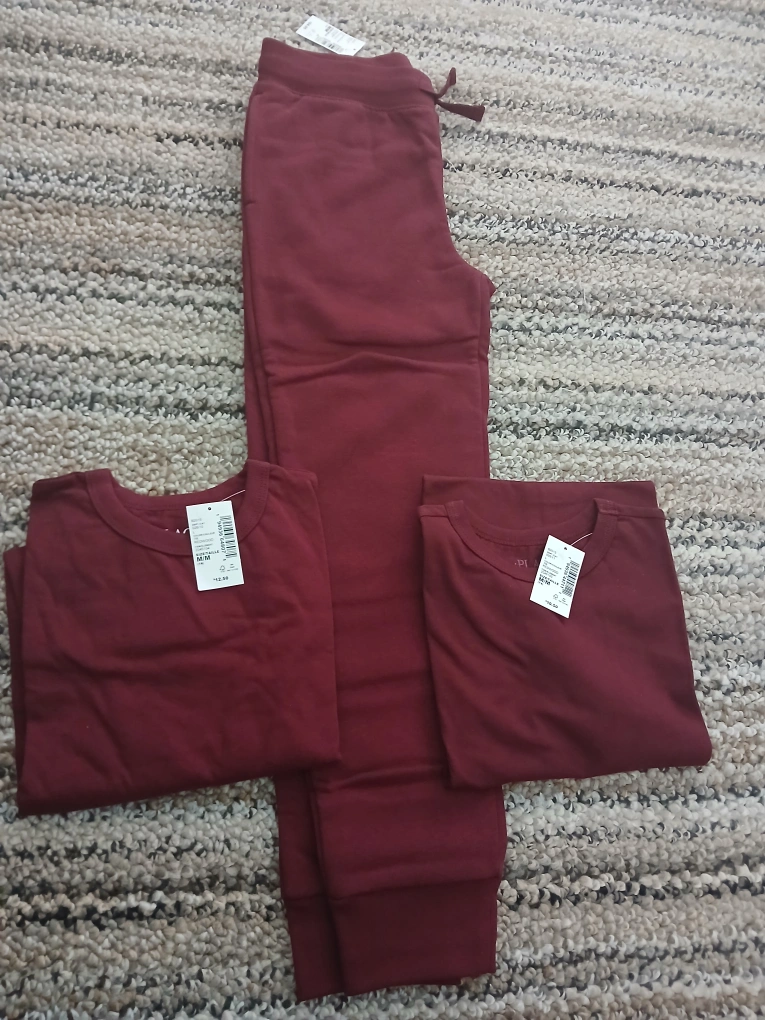 I have a brand new Children's Place loungewear set for sale! It includes a pair of sweatpants and two t-shirts, all in a matching burgundy color. The set is size 7/8. The original price for this set was $52.50, as shown on the tags
