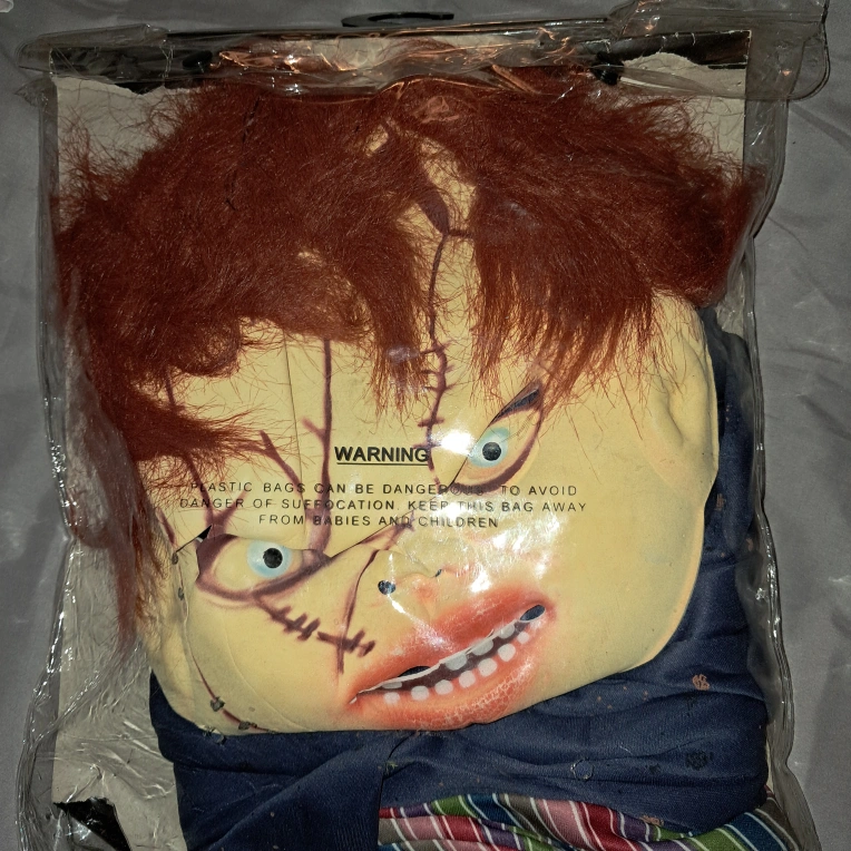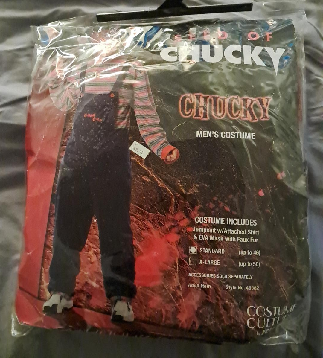 65Selling a Child's Play Chucky Men's Costume in size XL (up to 50). The costume includes a jumpsuit with attached shirt and an EVA mask with faux fur. The costume is still in its original packaging