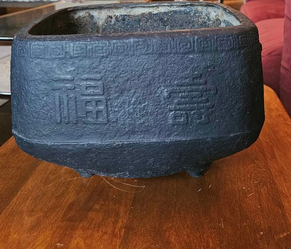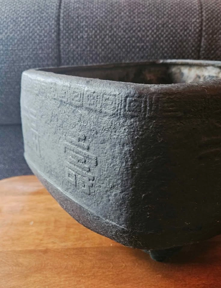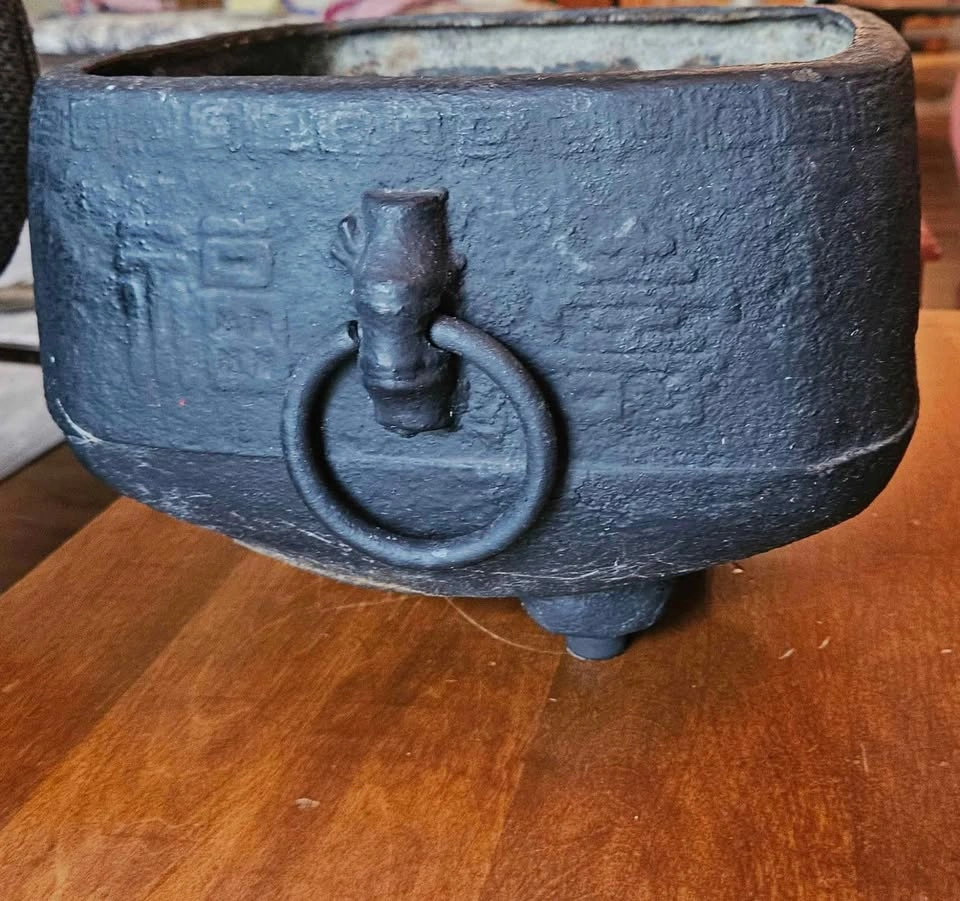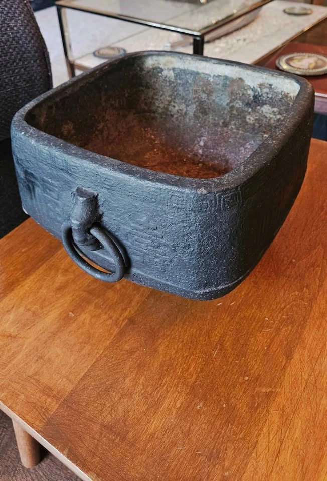 0China, 19th century or later. Square and double-handled on three feet with Chinese characters encircling outer rim and a repeating geometric pattern to upper edge. Property from a Private Japanese Collection. Measure: Height 7", Length 9.81", width 8.81". Heavy weighs.