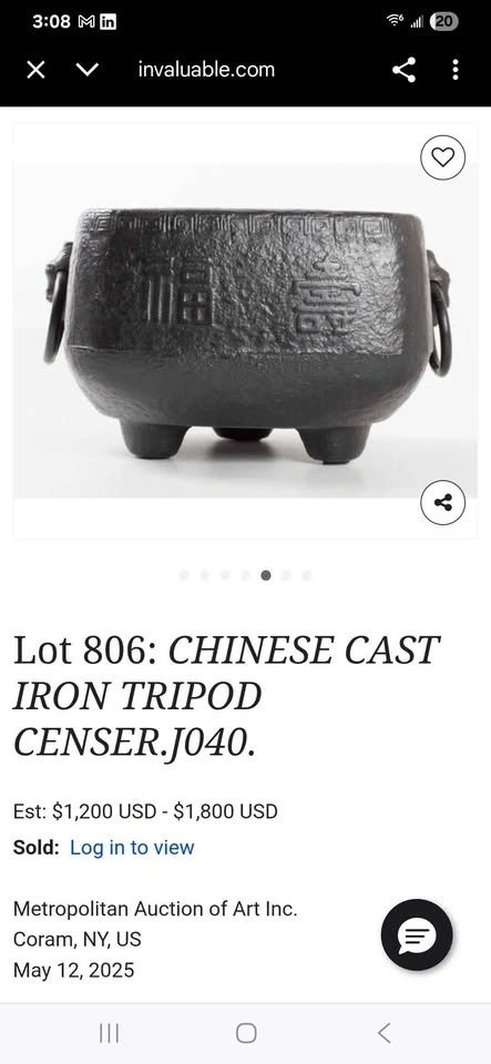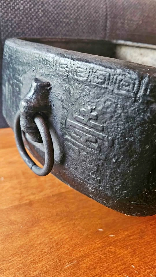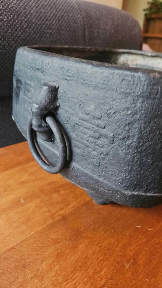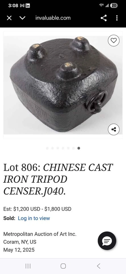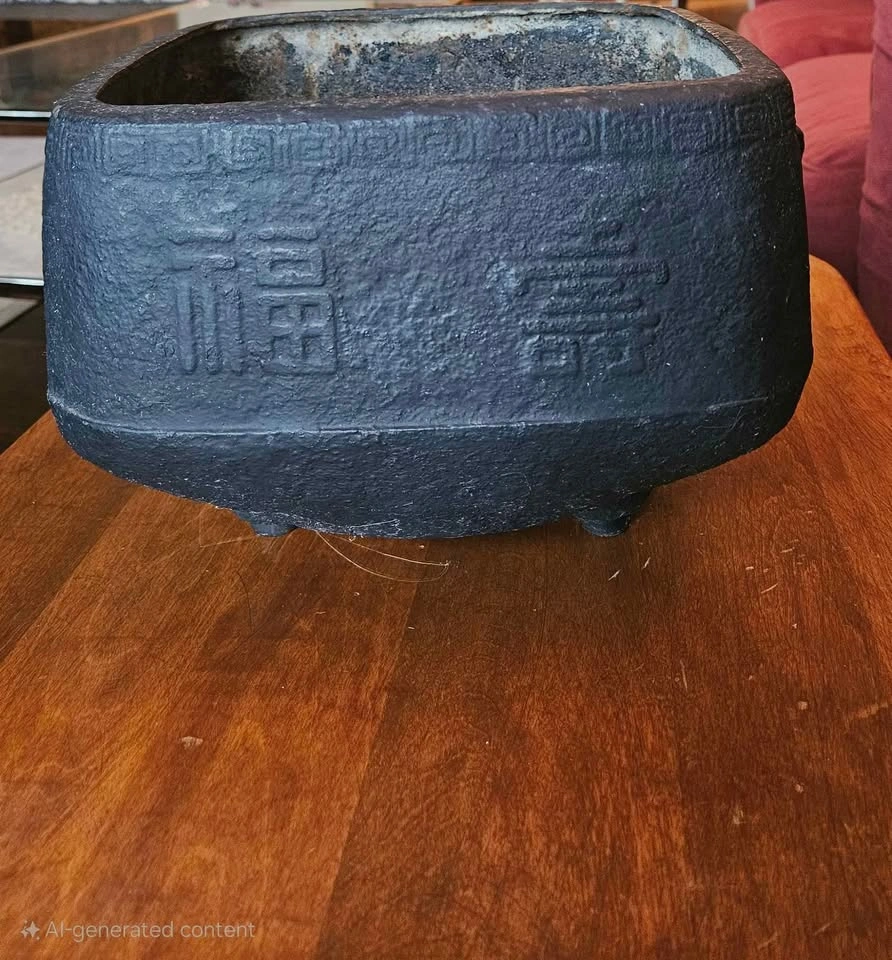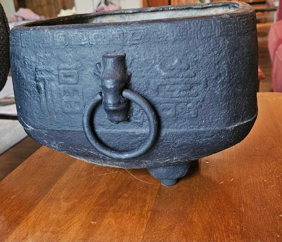 0China, 19th century or later. Square and double-handled on three feet with Chinese characters encircling outer rim and a repeating geometric pattern to upper edge. Property from a Private Japanese Collection. Measure: Height 7", Length 9.81", width 8.81". Heavy weighs.