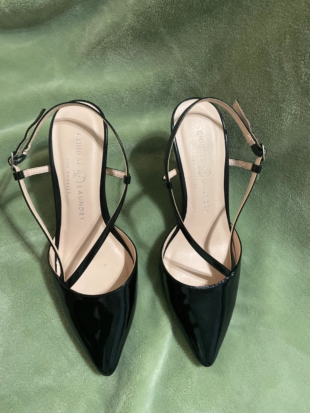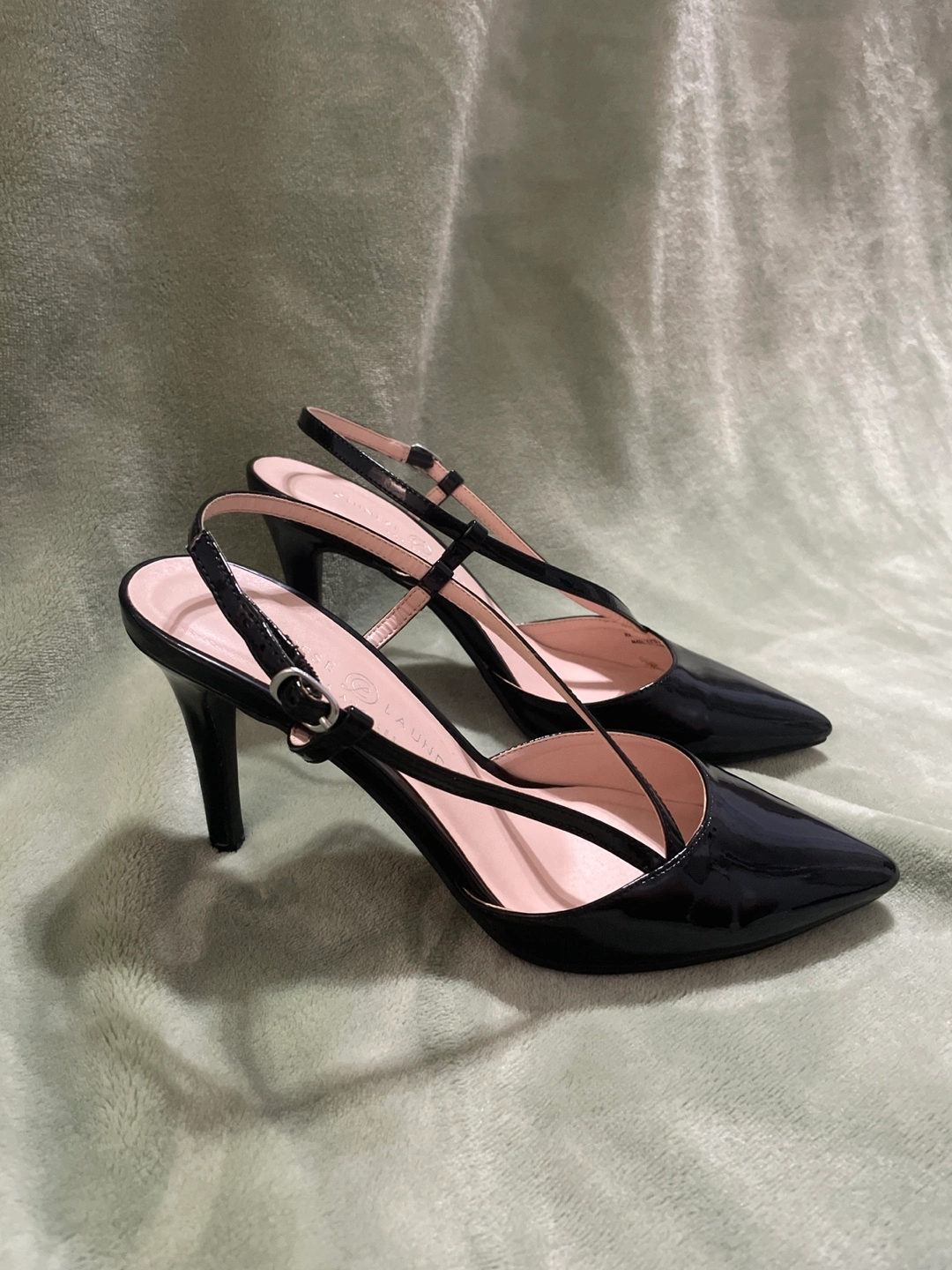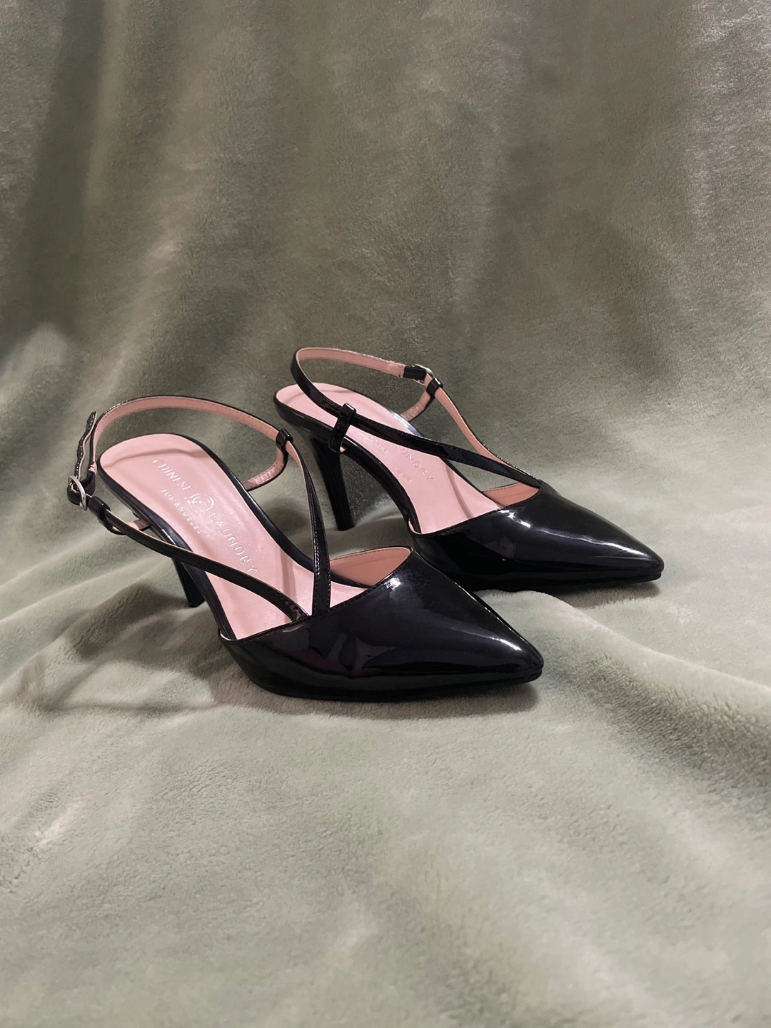 82Pair of slingback heels in black. The shoes feature a pointed toe and a stiletto heel. They have thin straps and a buckle closure. Imagine wearing these on a night out with friends. Smoke free home