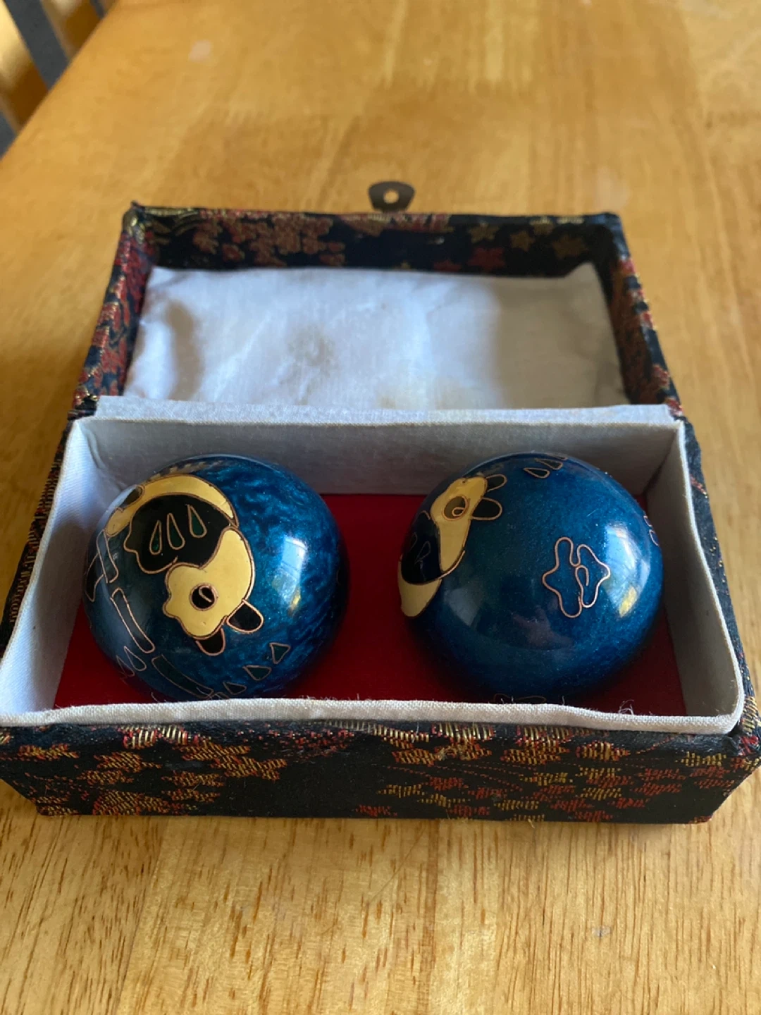 60Selling a set of Chinese Baoding balls in their original box. These are a beautiful blue color with a gold design. They're in great condition and ready for a new home! You can hold and turnaround both ball in your hand and stimulate thinking cells of your brain