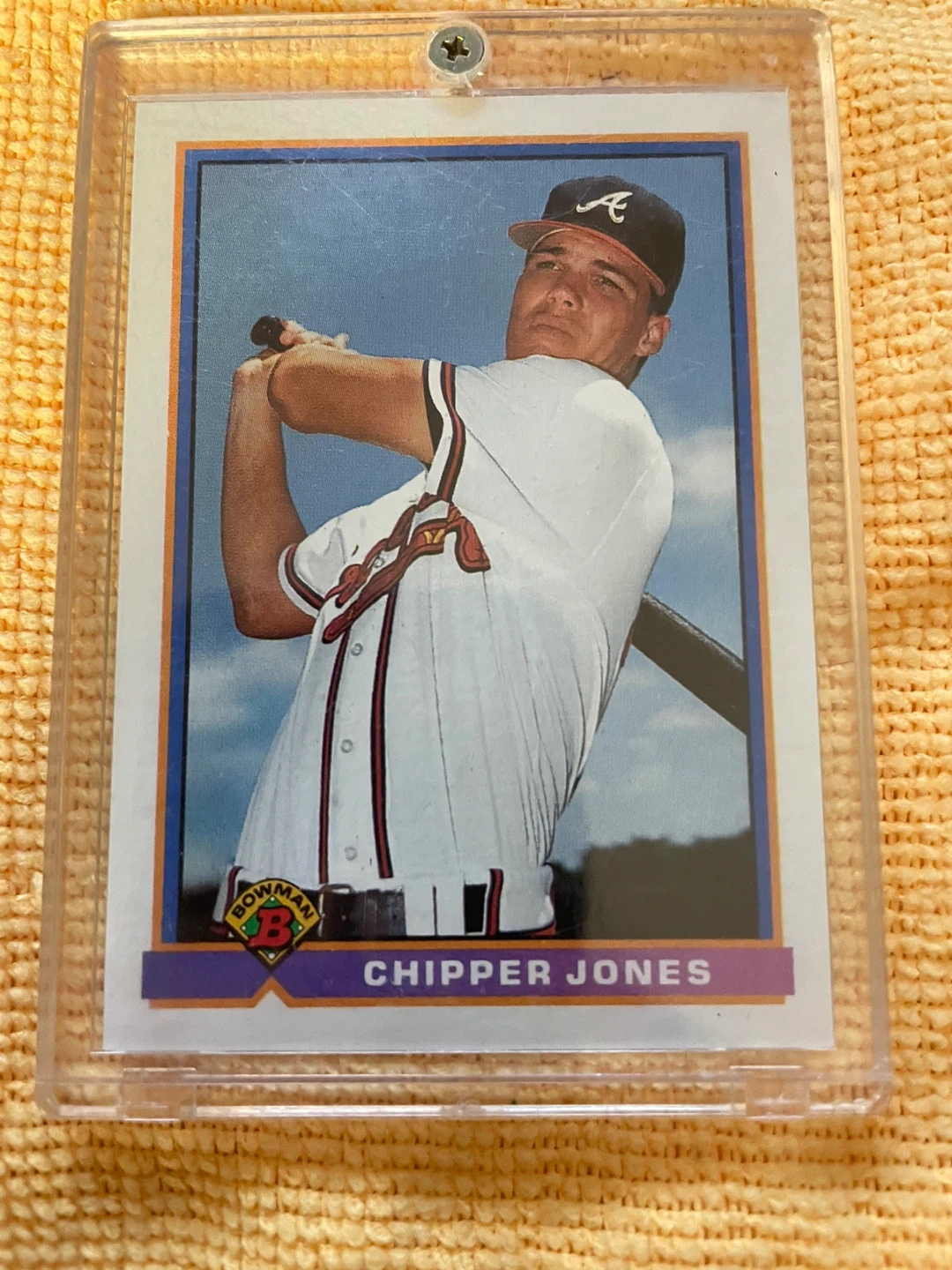 66Selling a 1991 Bowman baseball card featuring Chipper Jones! This card highlights his debut with the Gulf Coast Braves in 1990. A great addition to any baseball card collection