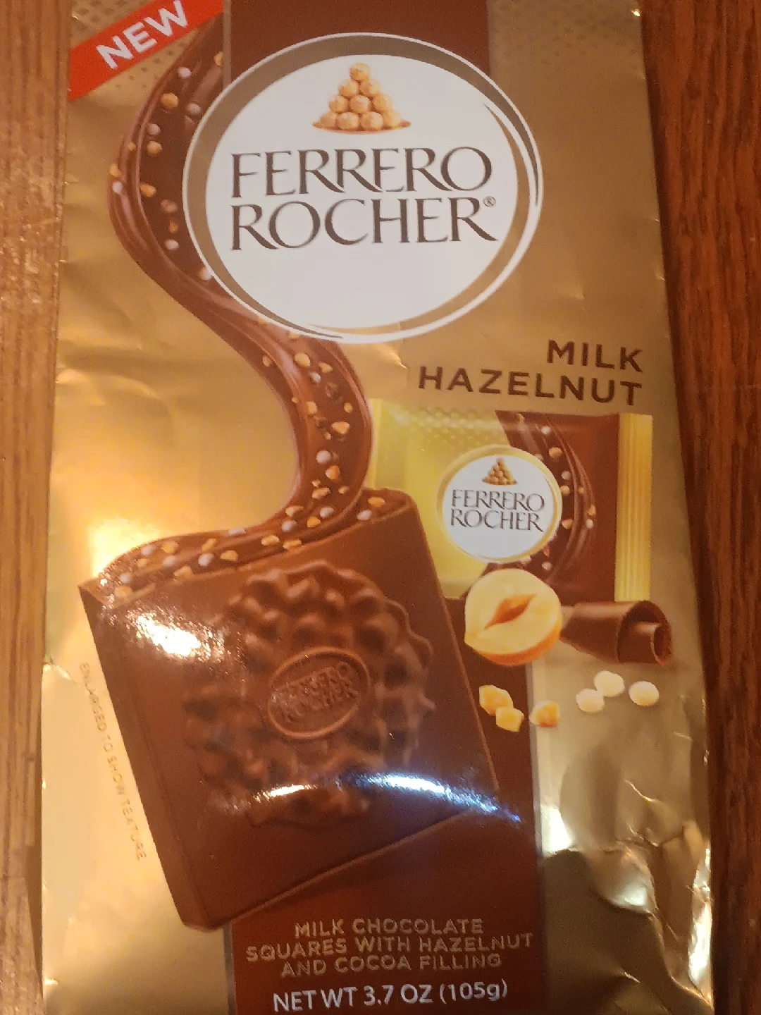 775Selling a bag of Ferrero Rocher Milk Hazelnut Chocolate squares. It's a milk chocolate squares with hazelnut and cocoa filling, net weight 3.7 oz (105g) 10 pieces