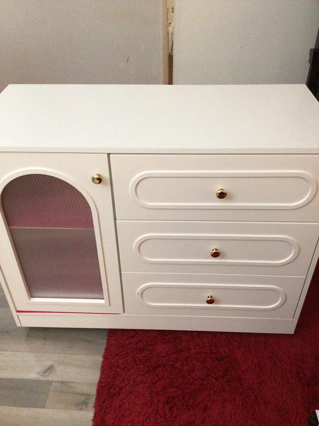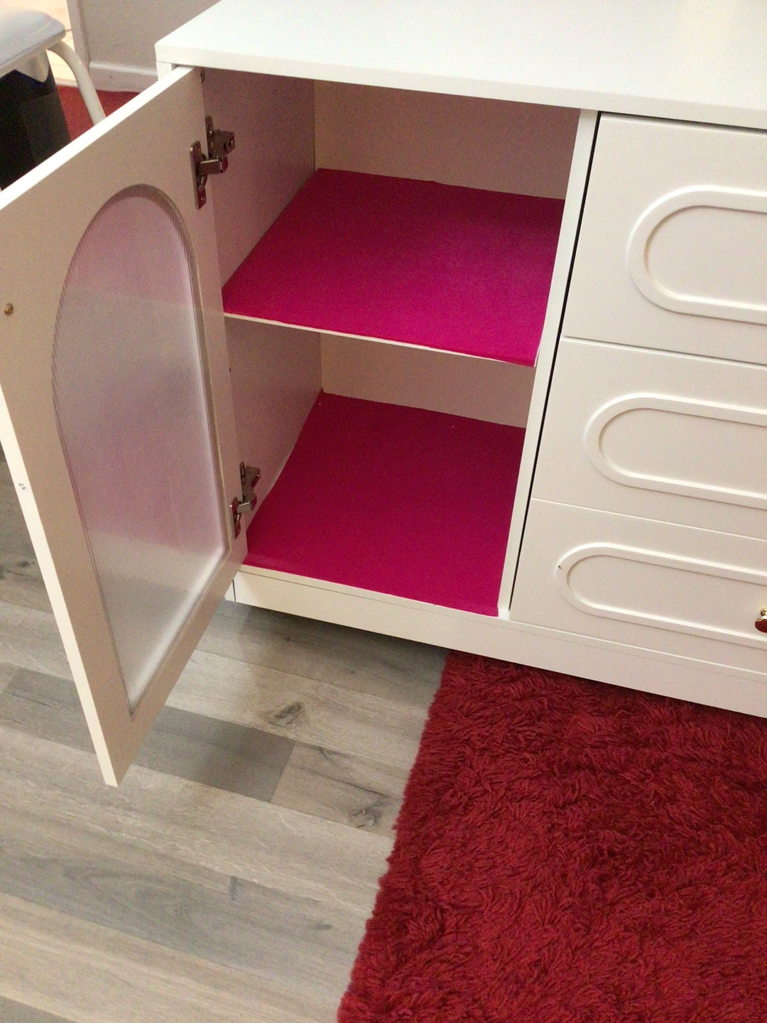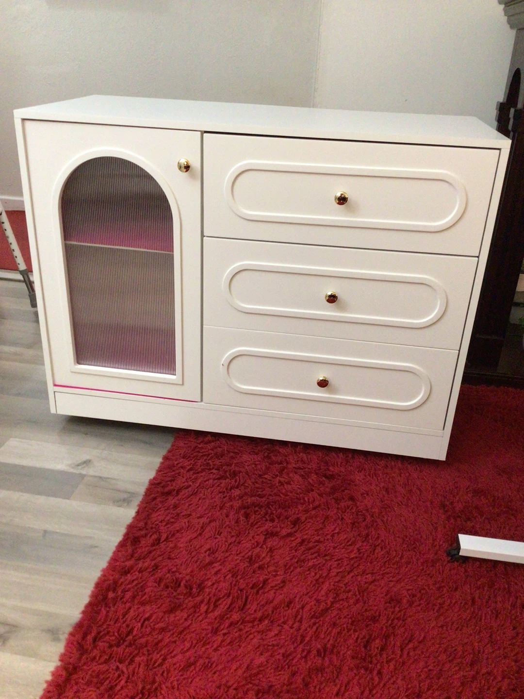 This is a white dresser with three drawers and a cabinet door. The cabinet has two shelves inside, lined with pink material. It's ideal for a bedroom or nursery. Comes with locking wheels easy to move