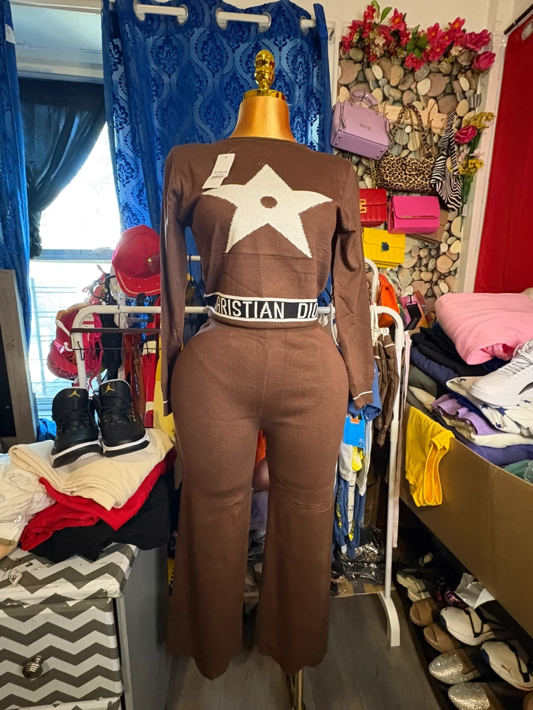 Selling a cute Christian Dior knit set! It's a stylish brown color and features the iconic Dior logo on the waistband. Perfect for a chic and comfortable look!